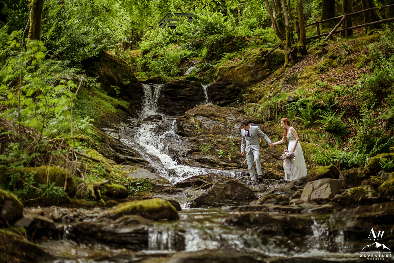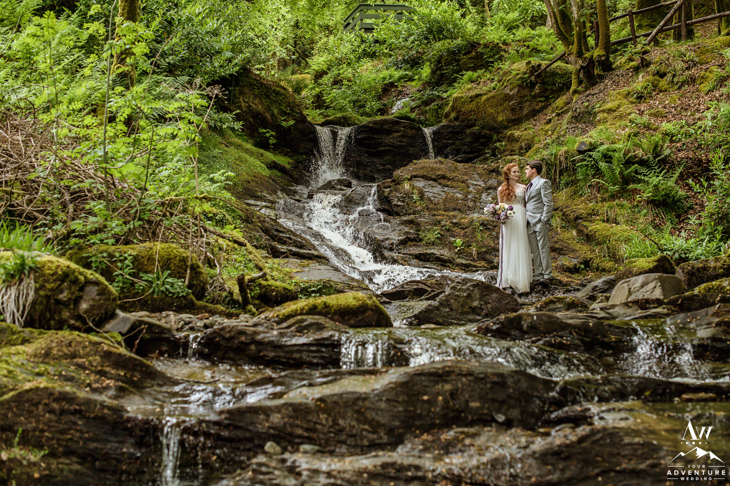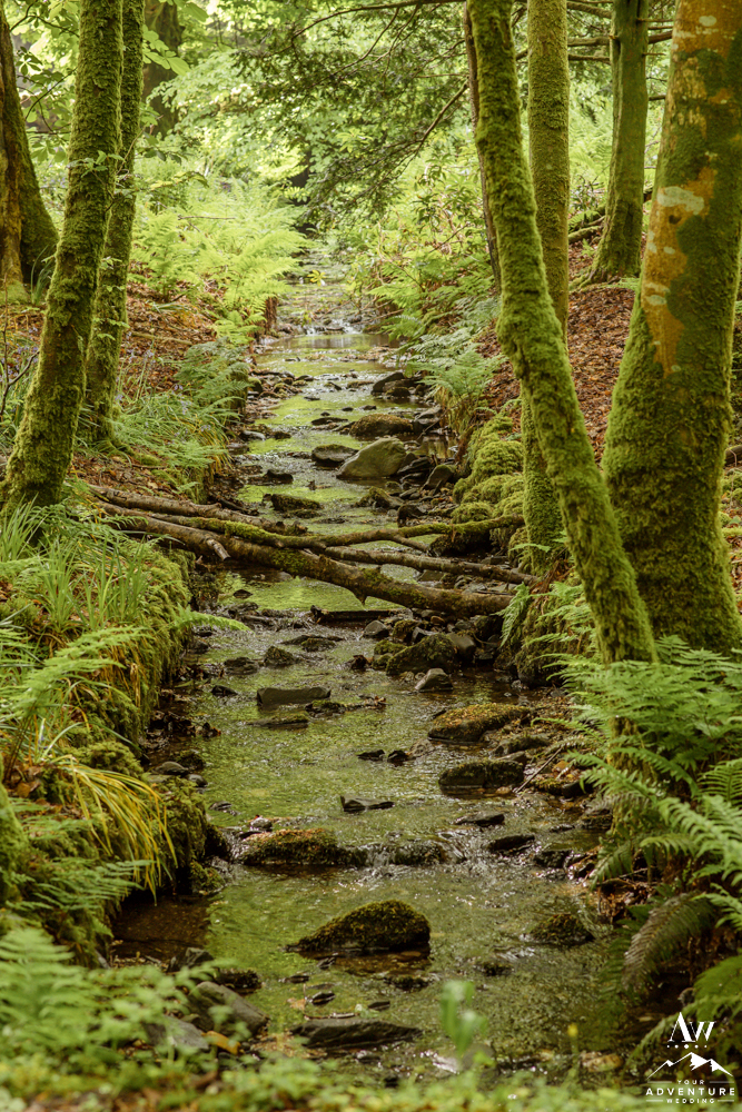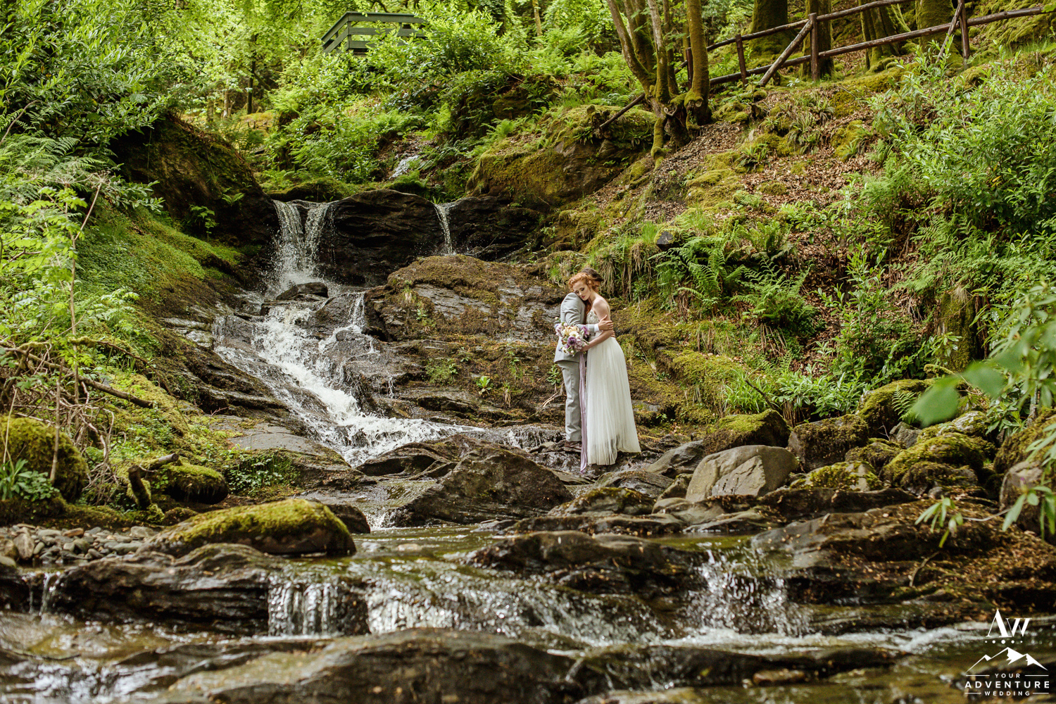 The roads within the Cowal Way (and within Argyll and Bute), were of stone or dirt texture, and frankly it added to the adventurous charm. Before finding the Cowal Way, we had an image of the Lake Lochmond area as being a pretty generic Scotland wedding location. And by generic we just felt it didn’t offer the true adventure wedding style we at Your Adventure Wedding strive for… Which is offbeat and non-touristy. But when found the Argyll and Bute areas, we were blown away by the amount of beautiful options! There is a sense of untapped mystery and calmness about this area that speaks to our hearts. We even found our way to a secret waterfall to explore! Imagine your Scotland adventure wedding photos having this super cute waterfall as an exploration spot!