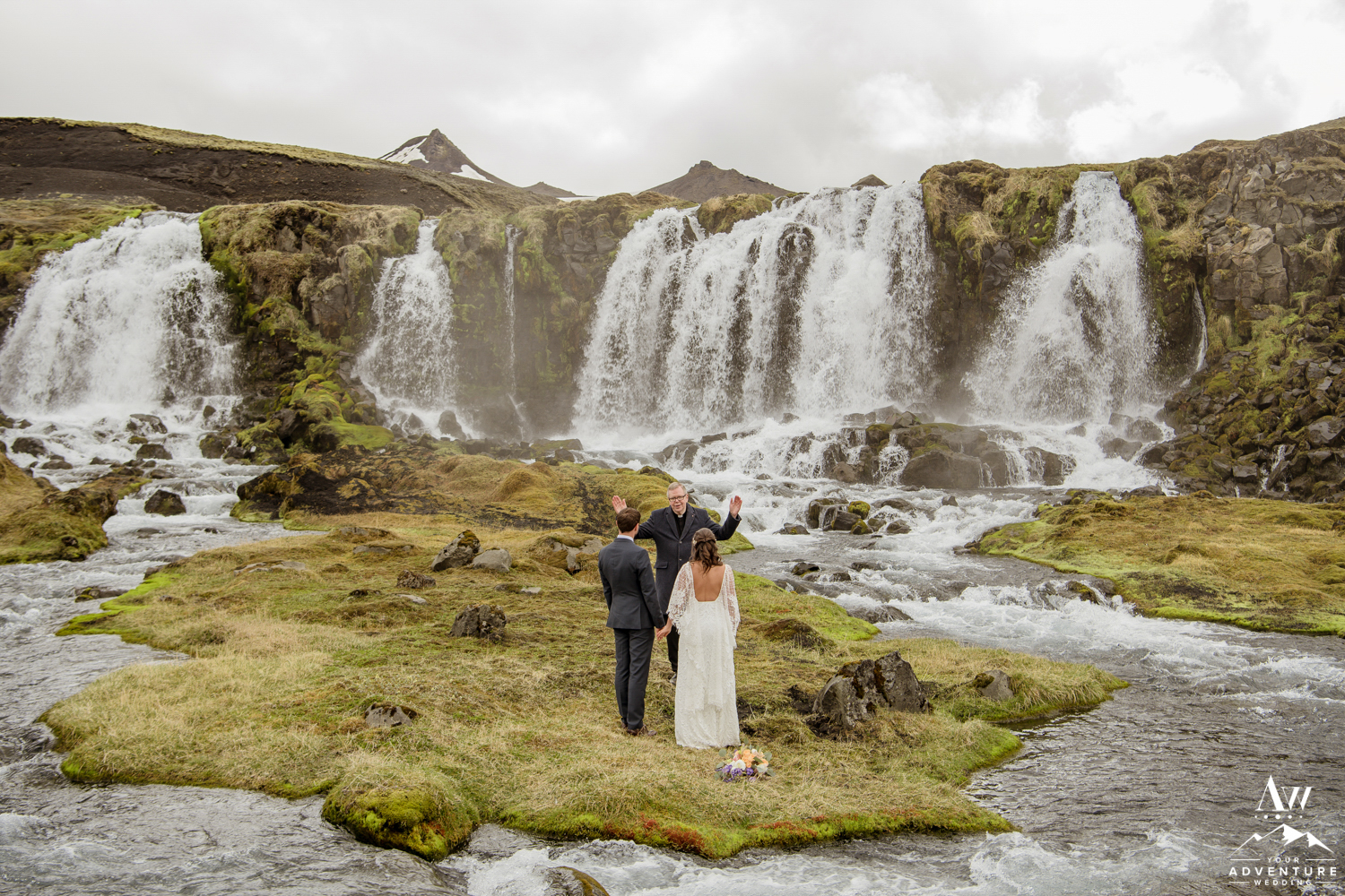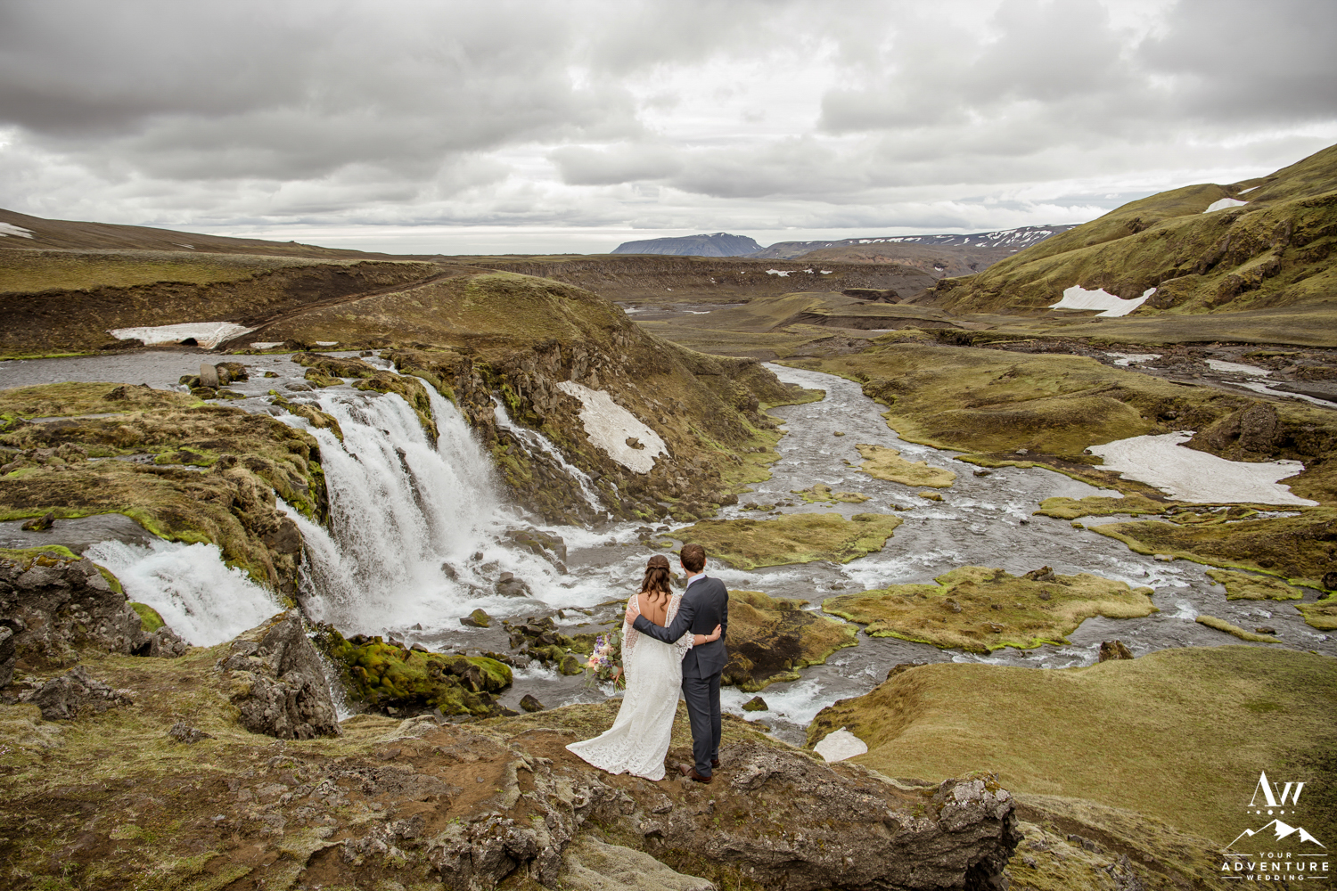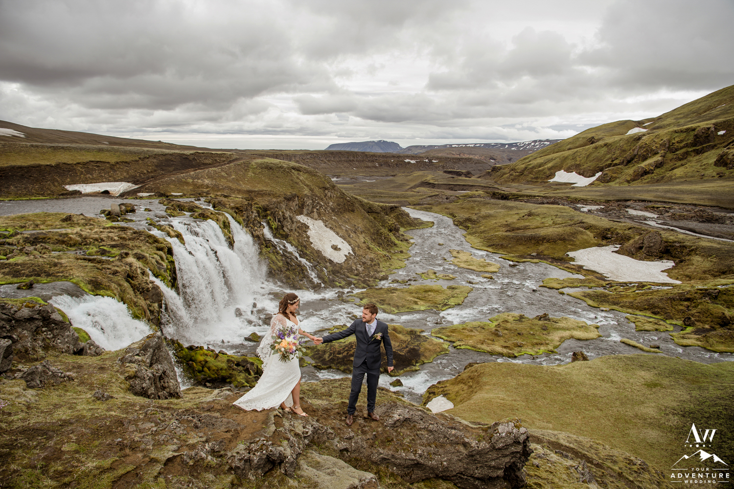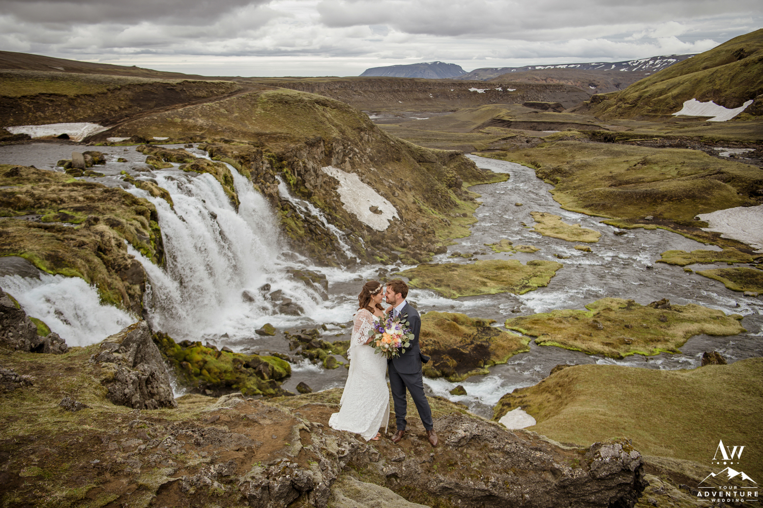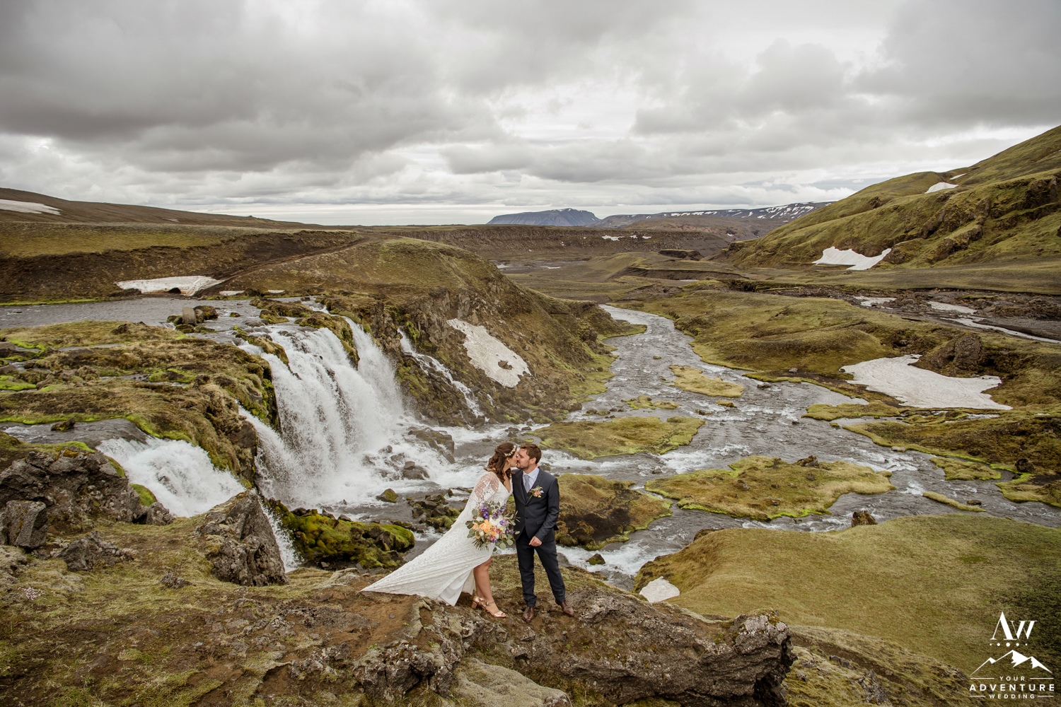 The drive to the highland waterfall is THE BEST! The super jeep splashes through rivers, lunar looking landscapes, a glacier, and crazy shaped mountains! Upon arriving to the waterfall area, Erin and Julian were super excited to choose their Iceland elopement ceremony location! Following, a local pastor performed their intimate and yet oh-so romantic wedding ceremony. It was truly unforgettable in the midst of the 360 views!
