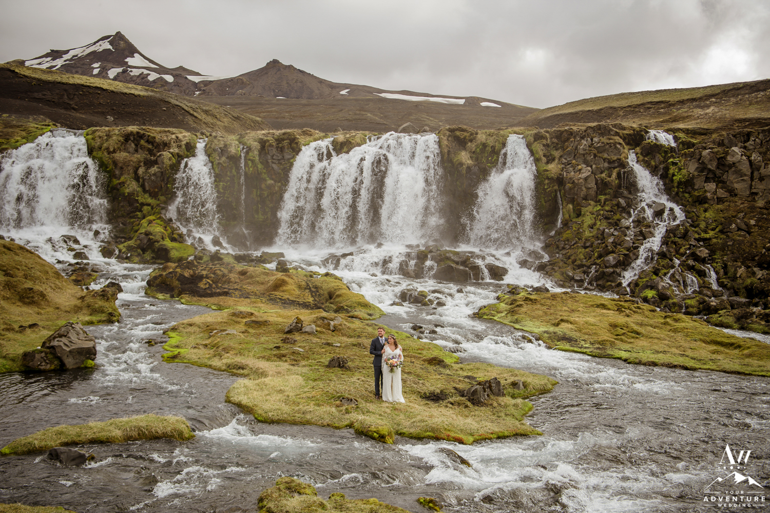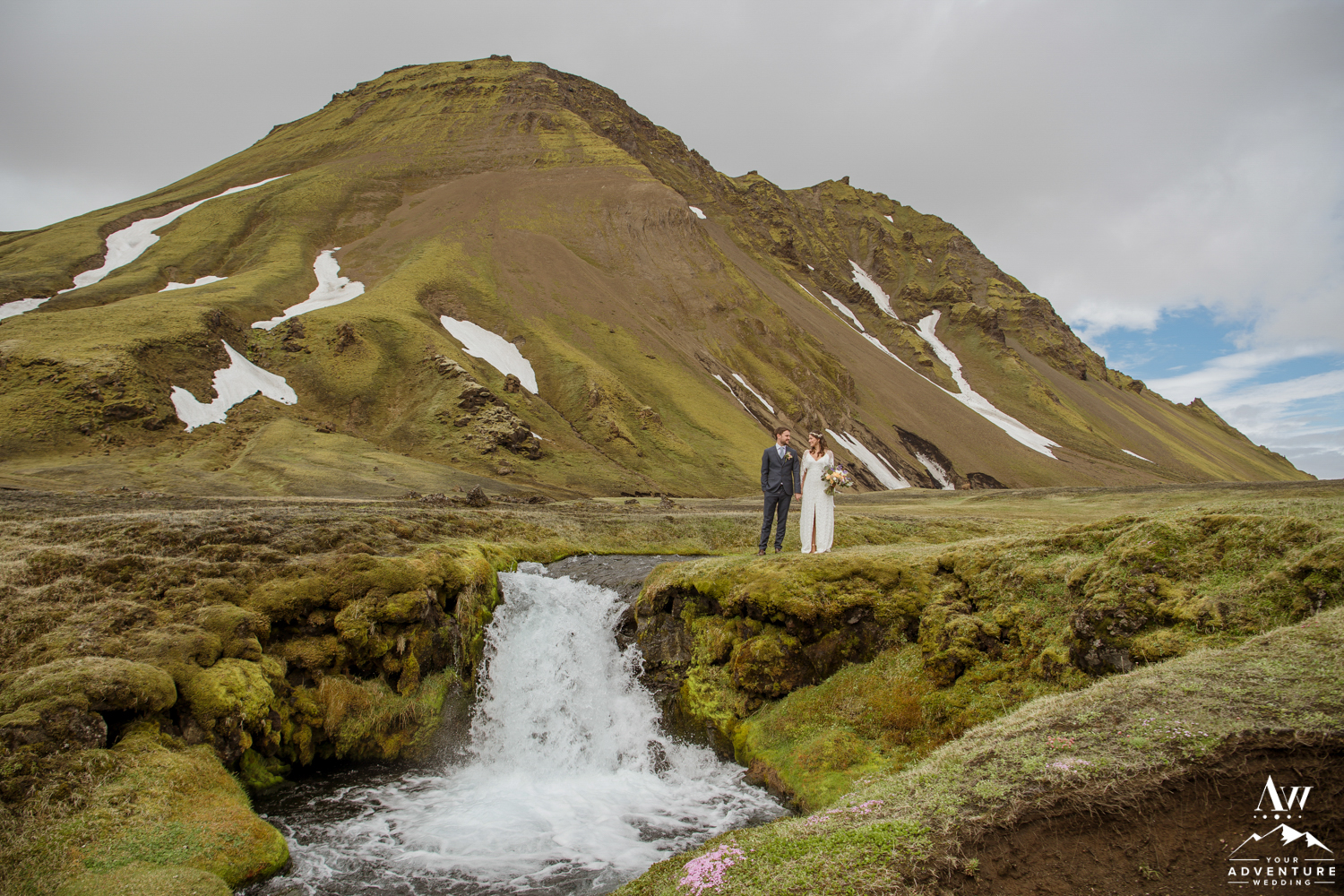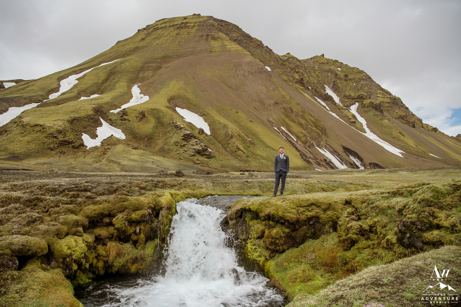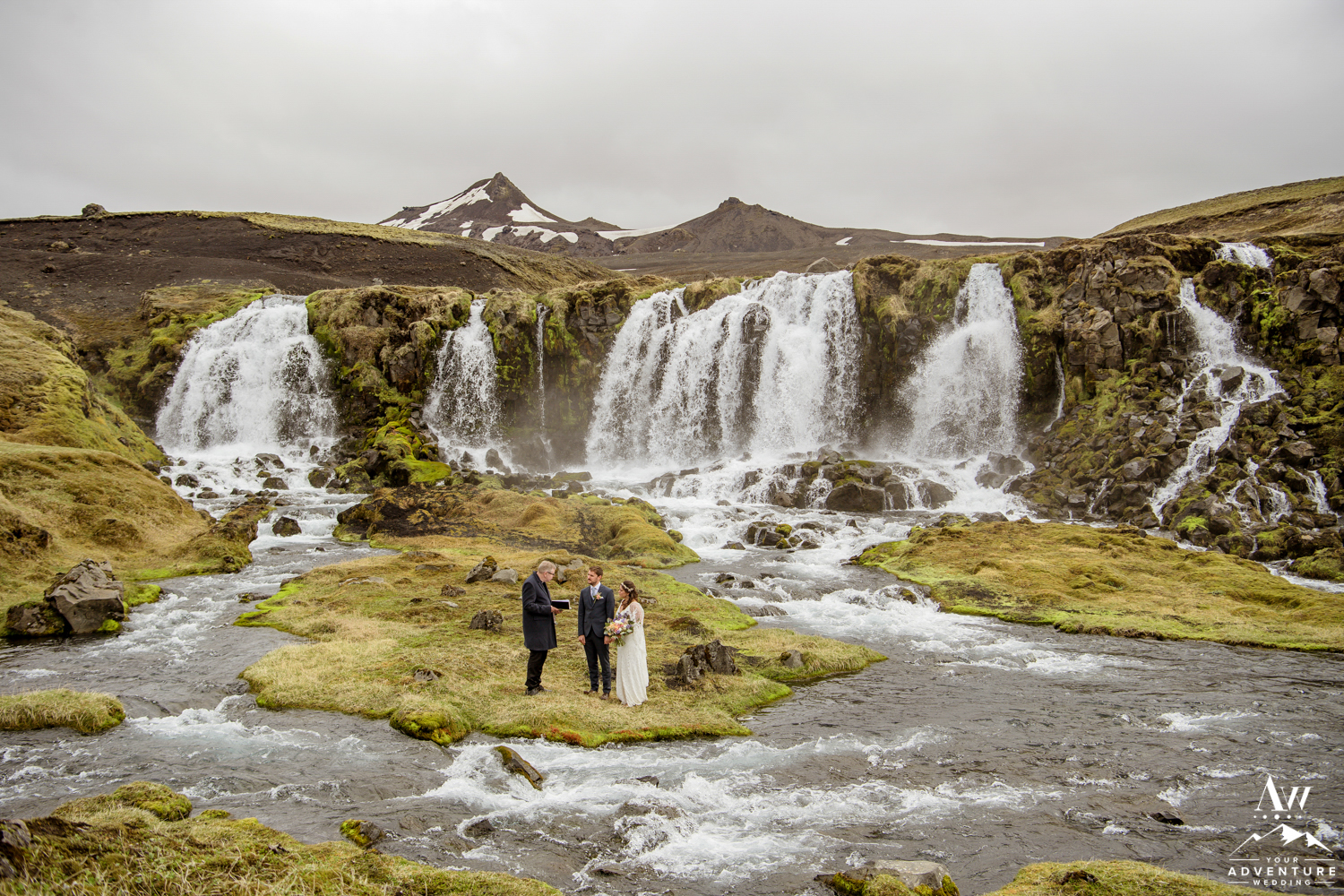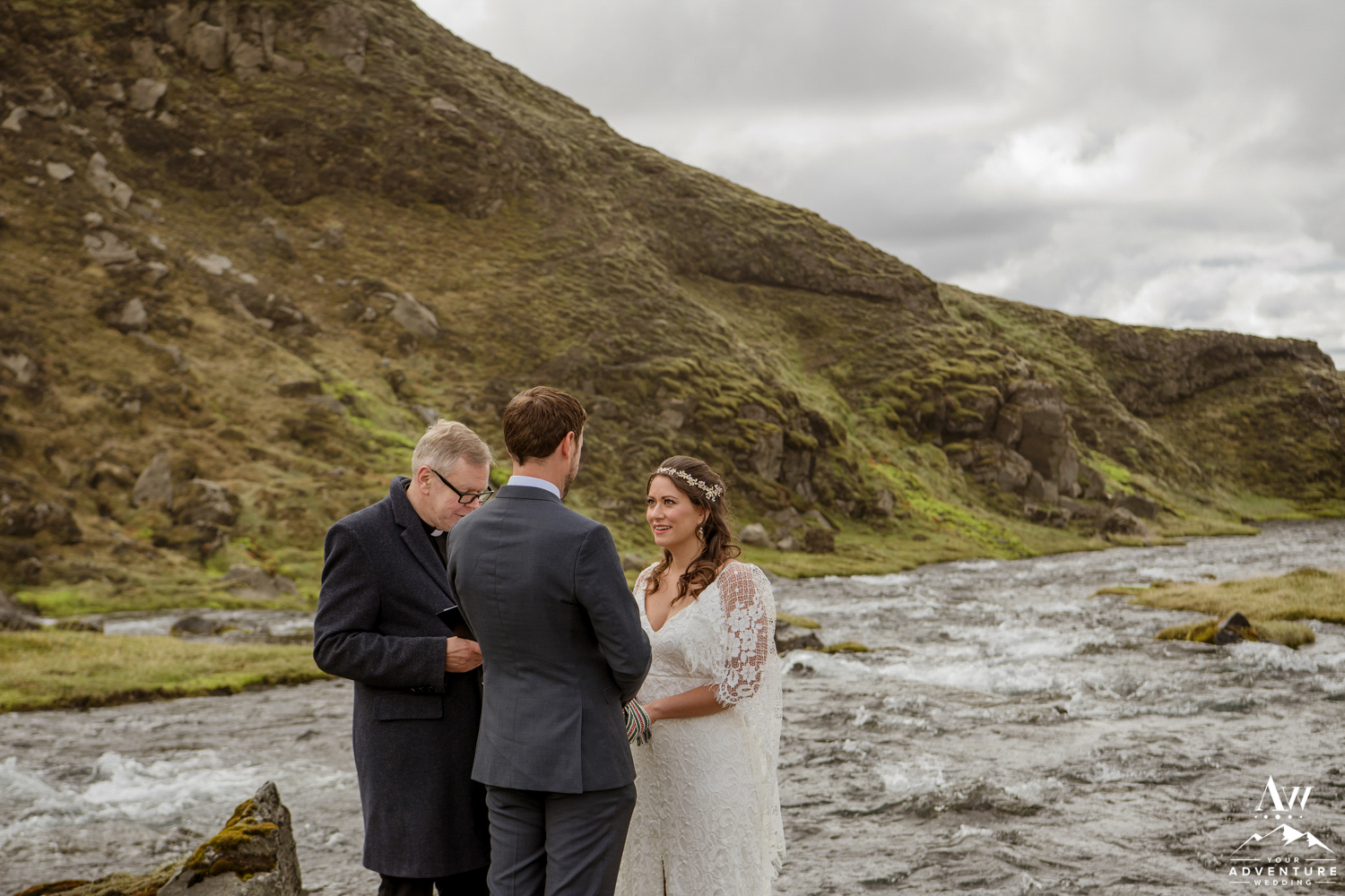 The drive to the highland waterfall is THE BEST! The super jeep splashes through rivers, lunar looking landscapes, a glacier, and crazy shaped mountains! Upon arriving to the waterfall area, Erin and Julian were super excited to choose their Iceland elopement ceremony location! Following, a local pastor performed their intimate and yet oh-so romantic wedding ceremony. It was truly unforgettable in the midst of the 360 views!