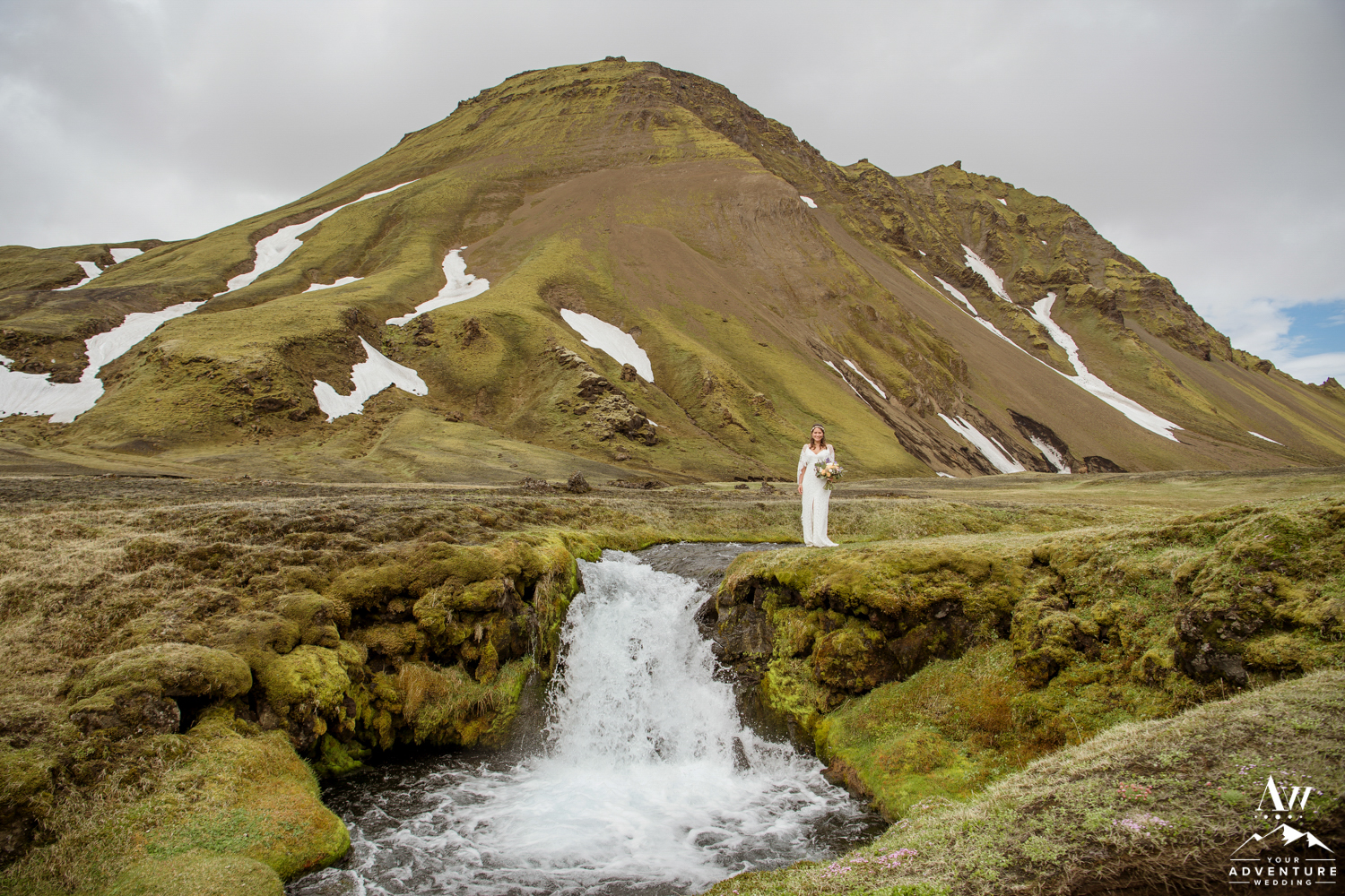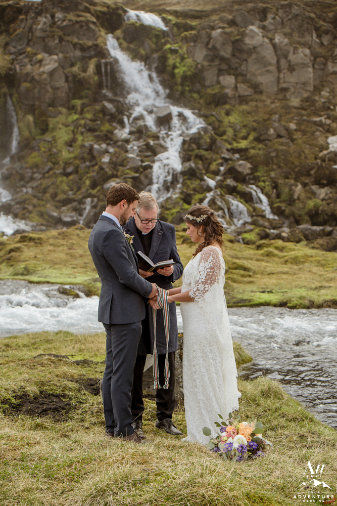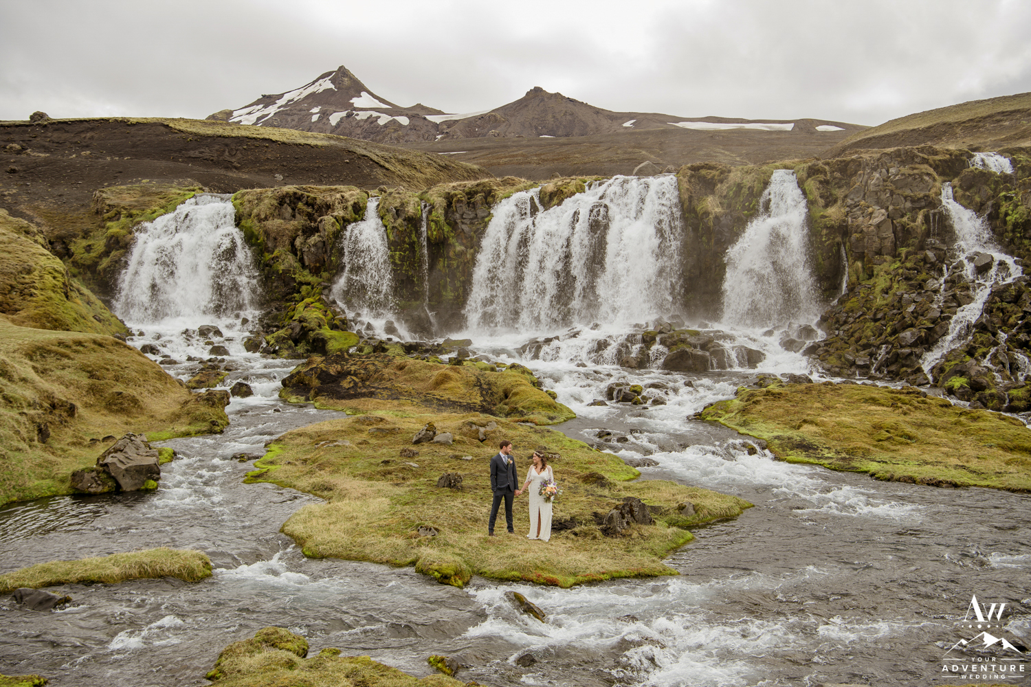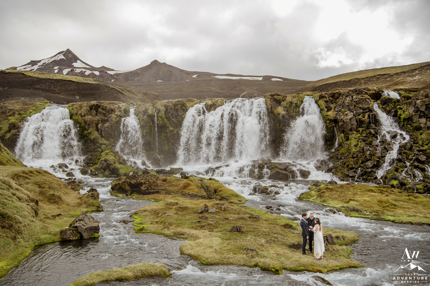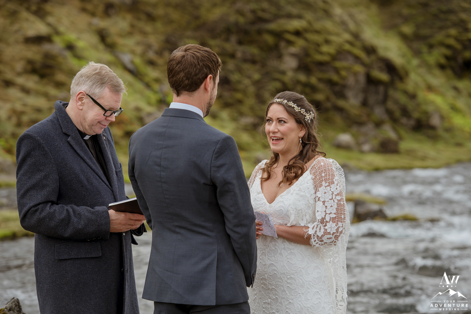 The drive to the highland waterfall is THE BEST! The super jeep splashes through rivers, lunar looking landscapes, a glacier, and crazy shaped mountains! Upon arriving to the waterfall area, Erin and Julian were super excited to choose their Iceland elopement ceremony location! Following, a local pastor performed their intimate and yet oh-so romantic wedding ceremony. It was truly unforgettable in the midst of the 360 views!
