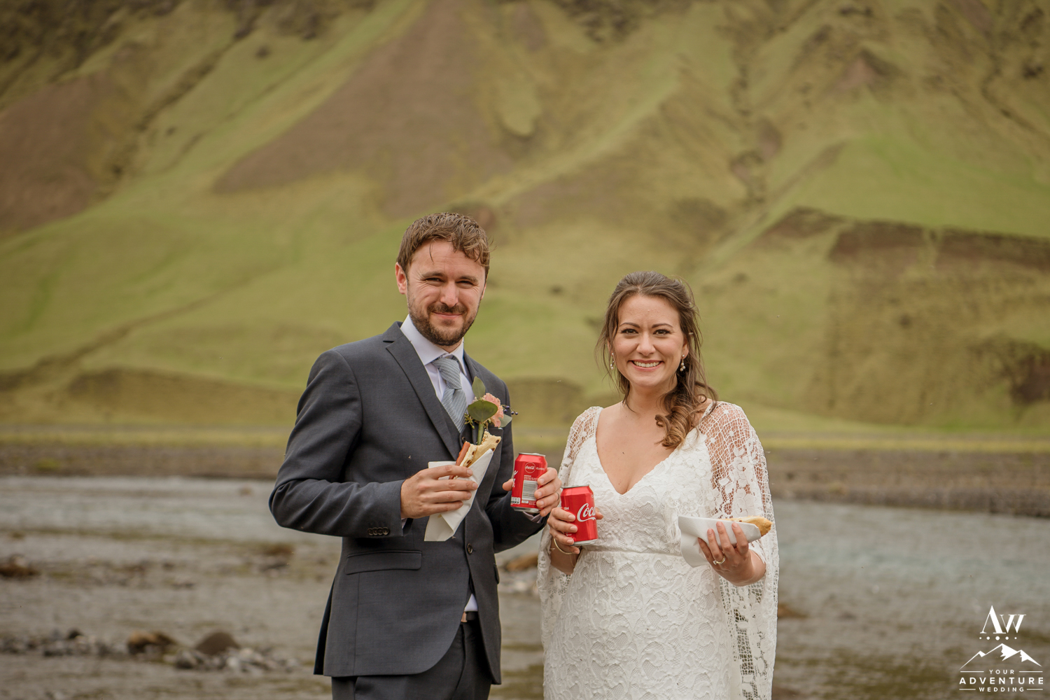 After returning from the hike during their Iceland elopement, our super jeep team was BBQ-ing lunch! A traditional hot dog BBQ was on the menu. But my American friends out there, don’t cringe. Icelandic hot dogs are TOTALLY different than the dirty American hot dogs made of who knows what! Namely, they are made from delicious lamb meat with other mouth watering toppings!