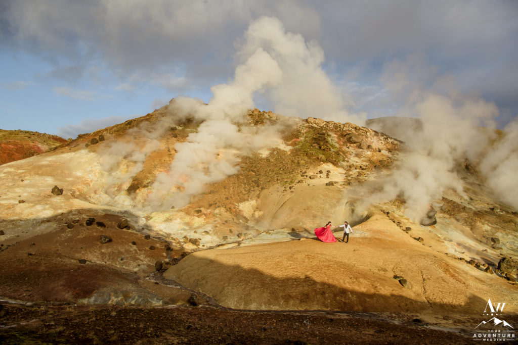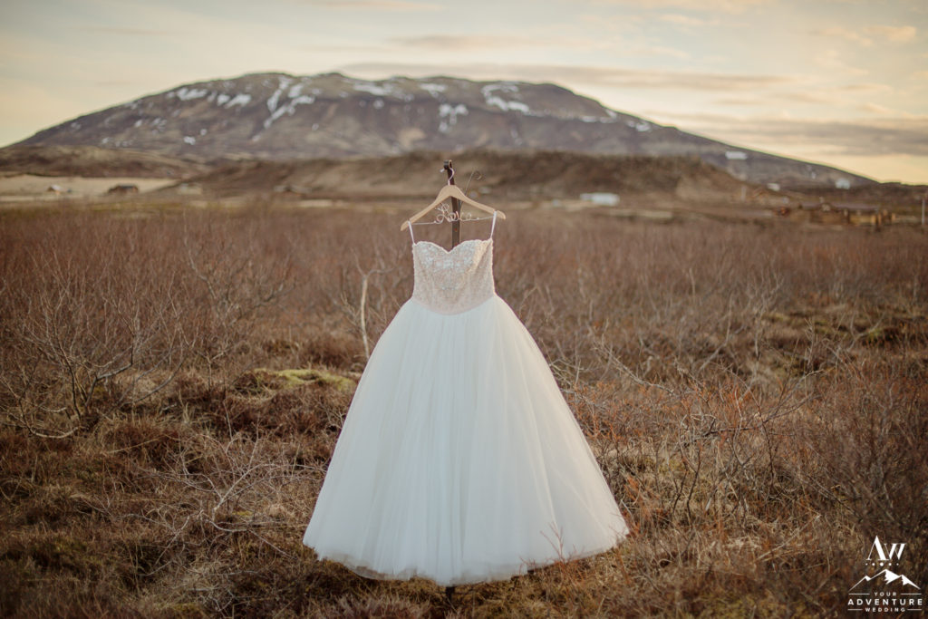 Some brides decide to go for a pop of color for their elopement dress. This can be a smart choice if you are concerned about dirt, mud, or sand showing on your gown. Layered colored fabrics and even dark colors like ash grey are less likely to show dirt – which can be a good thing when it comes time to take your photos. One of our favorite Iceland wedding dresses has been a bride who wore a black wedding dress!