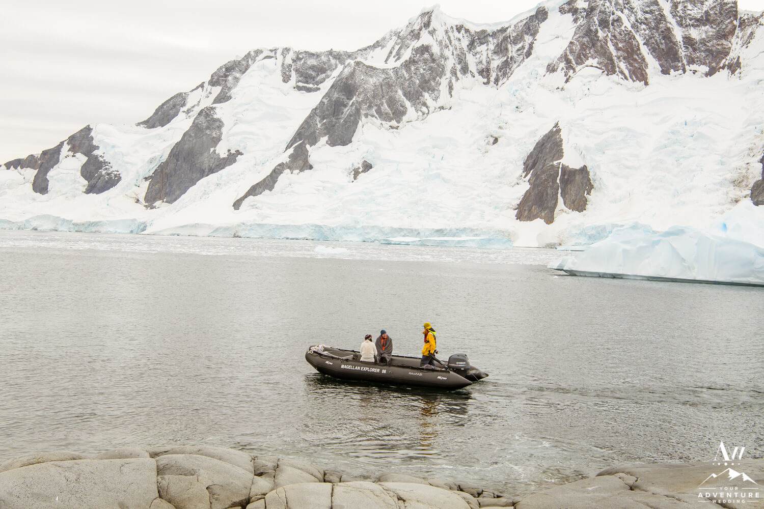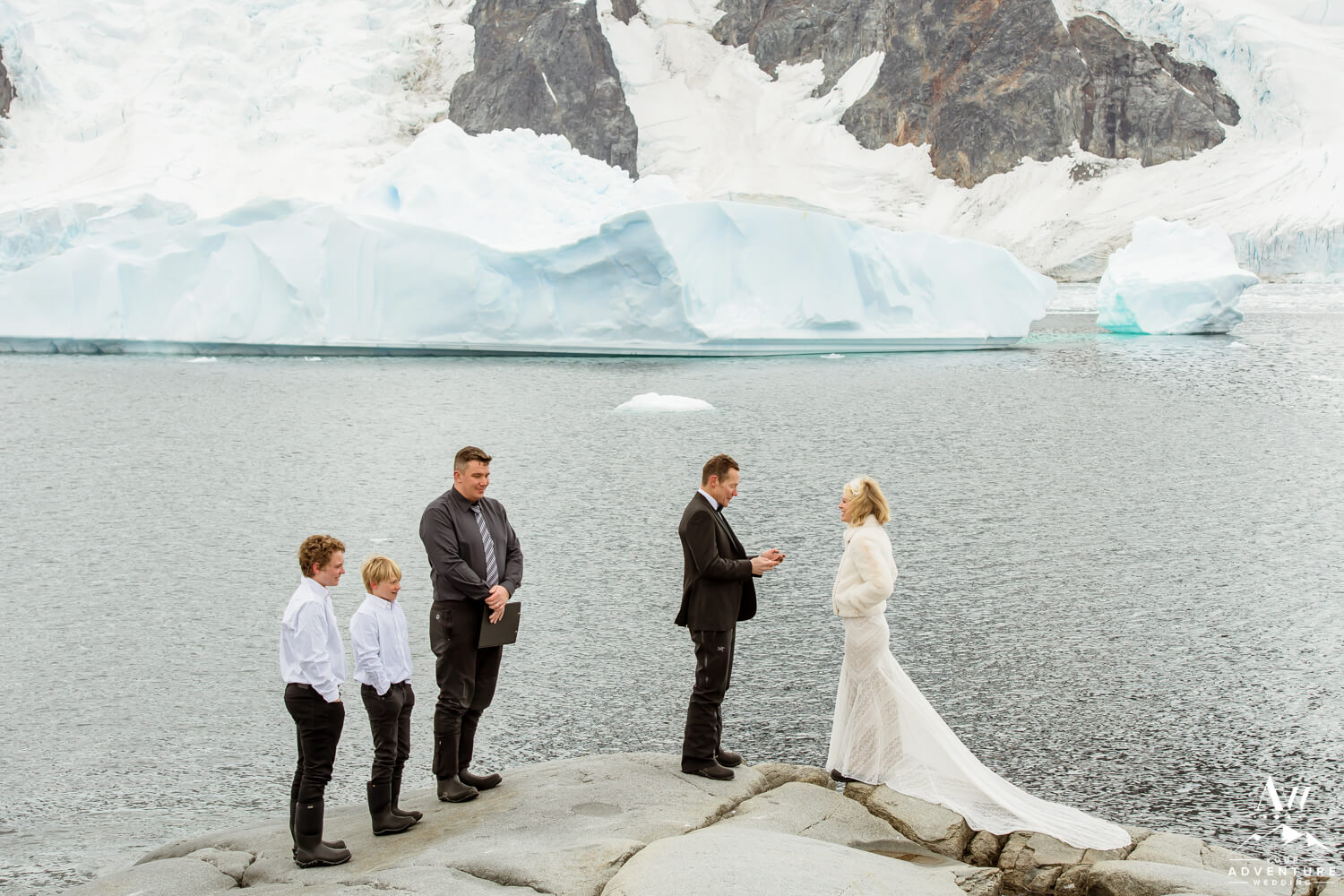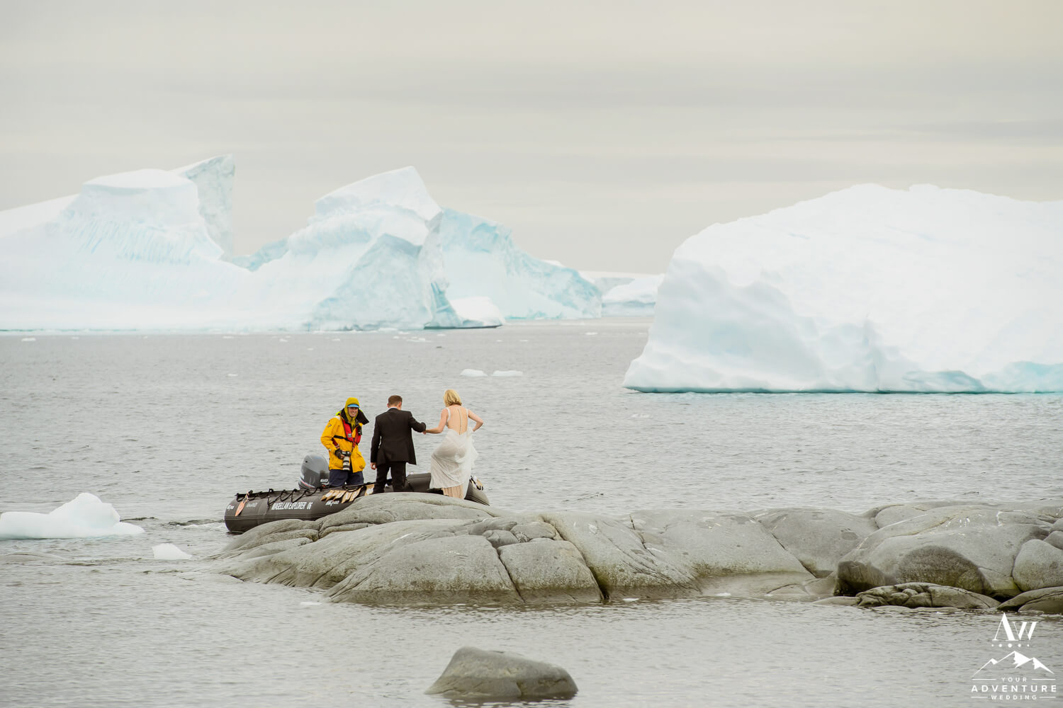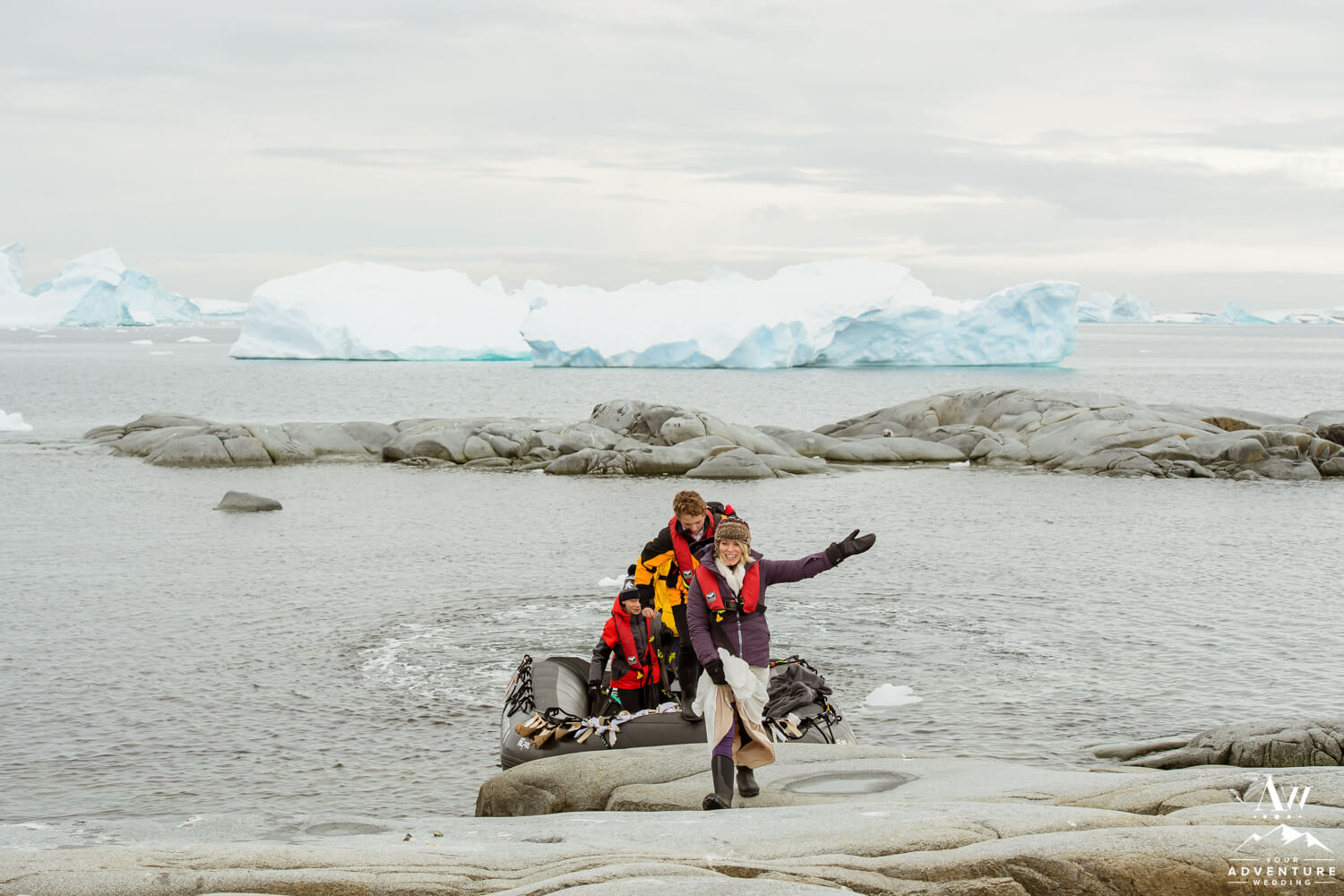 Around 9:45am the bride, groom, their 2 guests, legal celebrant, and photographer geared up and loaded into zodiacs. In fact, our Antarctica wedding planning team was able to arrange 2 private zodiacs for the group. Basically to ensure the opportunity for EPIC wedding photos.