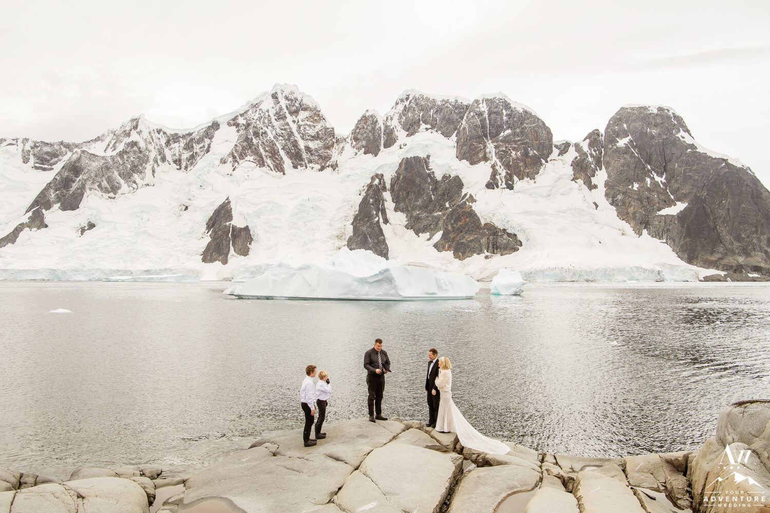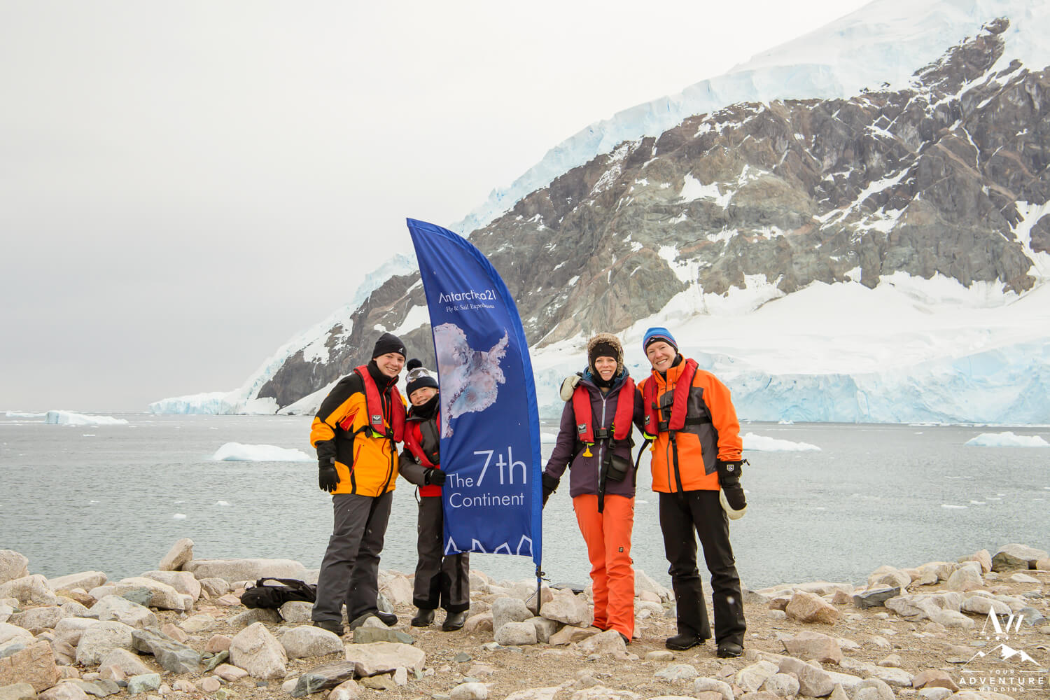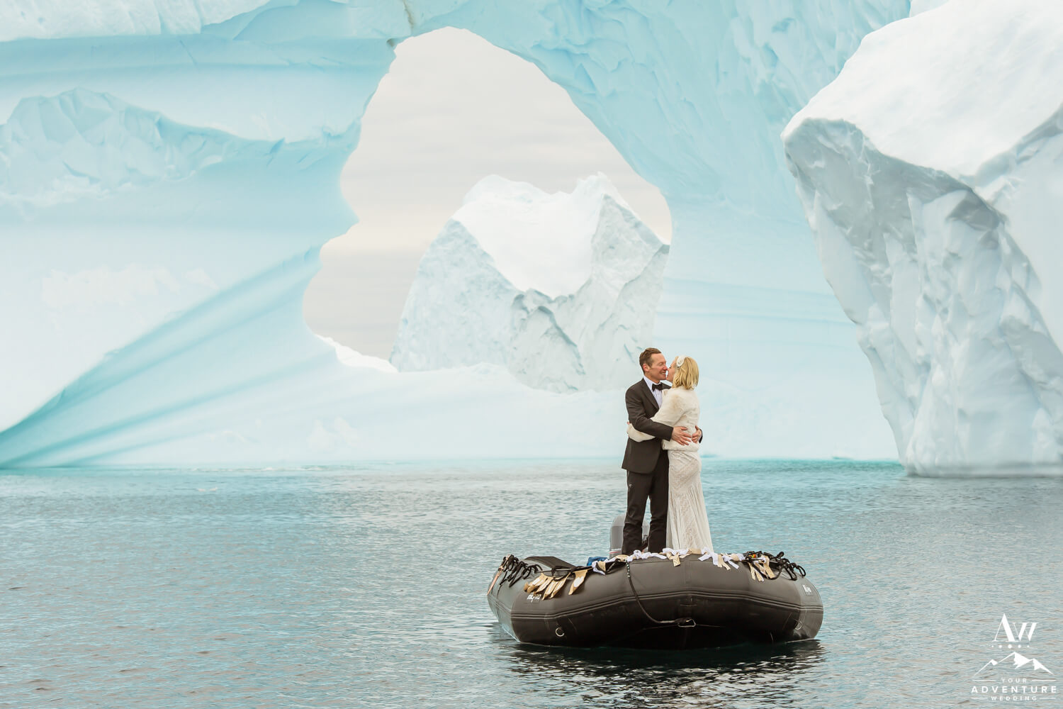 Around 9:45am the bride, groom, their 2 guests, legal celebrant, and photographer geared up and loaded into zodiacs. In fact, our Antarctica wedding planning team was able to arrange 2 private zodiacs for the group. Basically to ensure the opportunity for EPIC wedding photos.