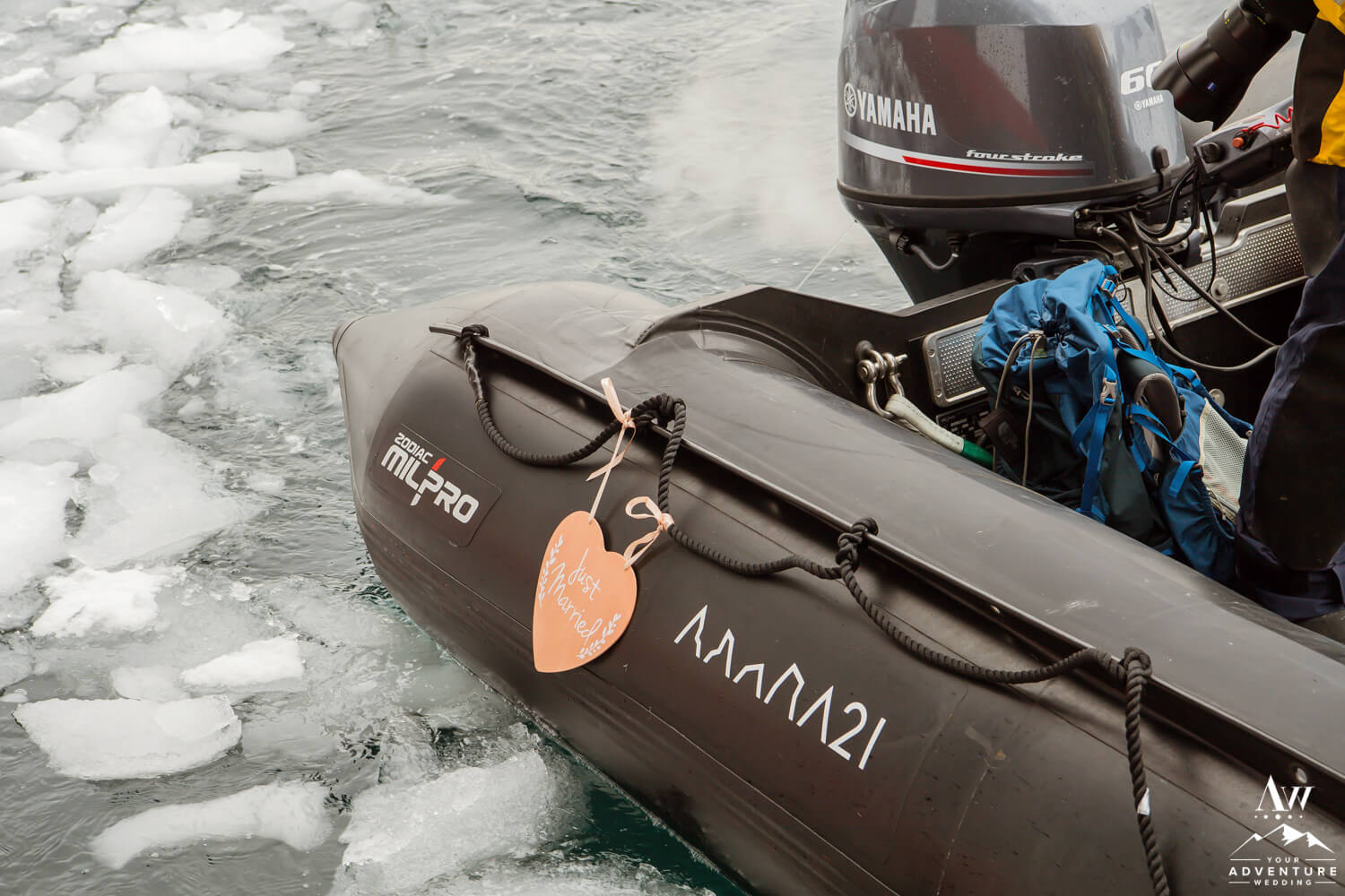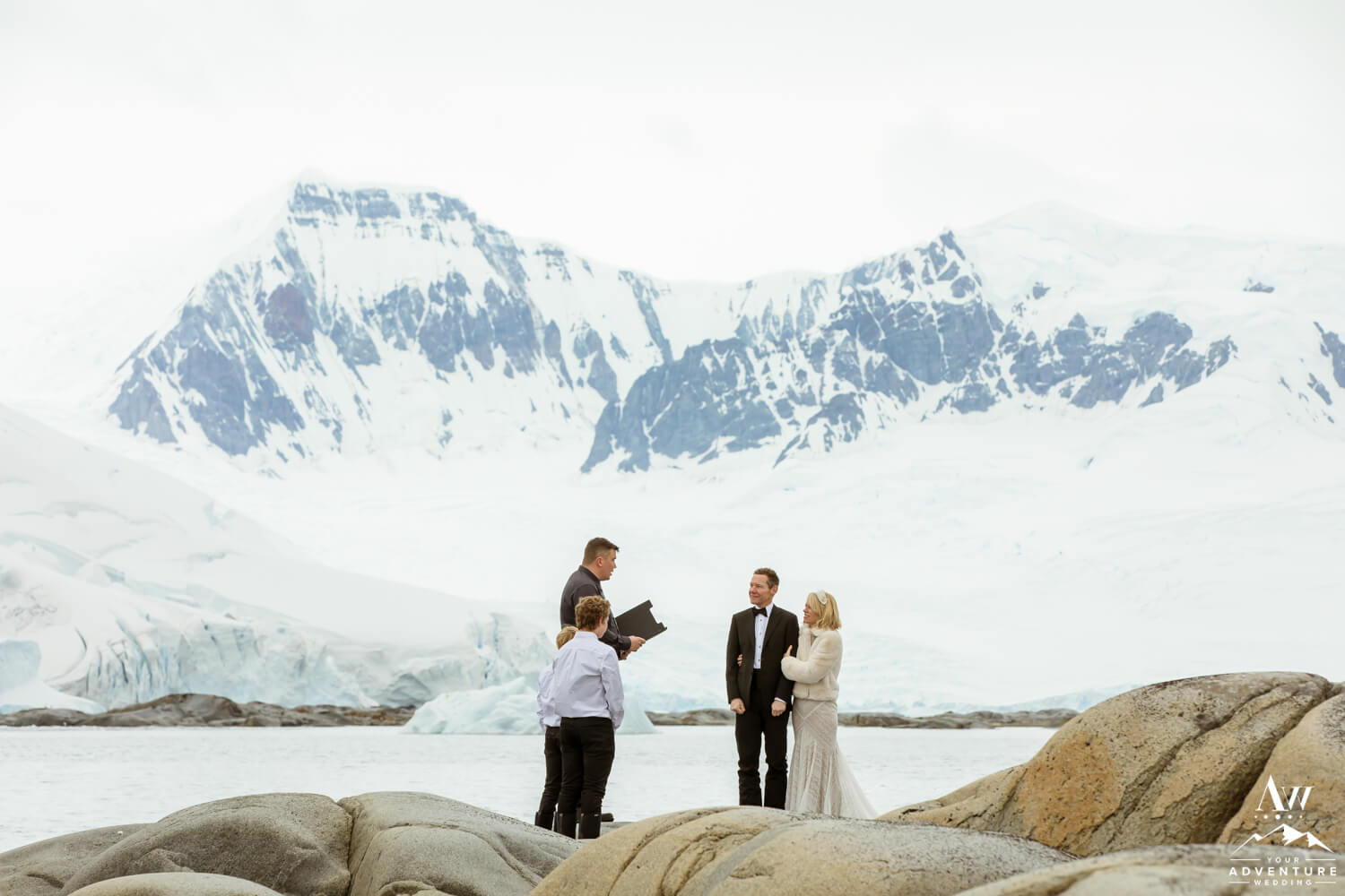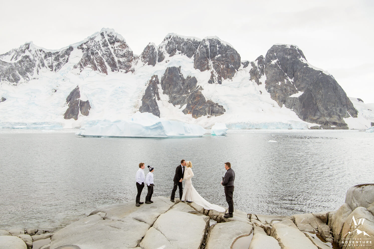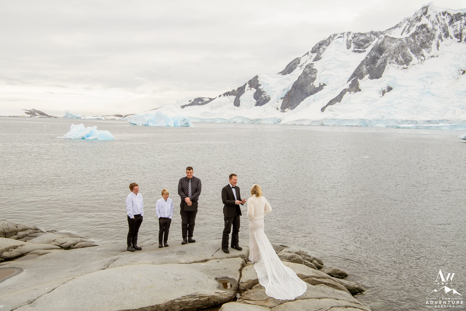 Around 9:45am the bride, groom, their 2 guests, legal celebrant, and photographer geared up and loaded into zodiacs. In fact, our Antarctica wedding planning team was able to arrange 2 private zodiacs for the group. Basically to ensure the opportunity for EPIC wedding photos.