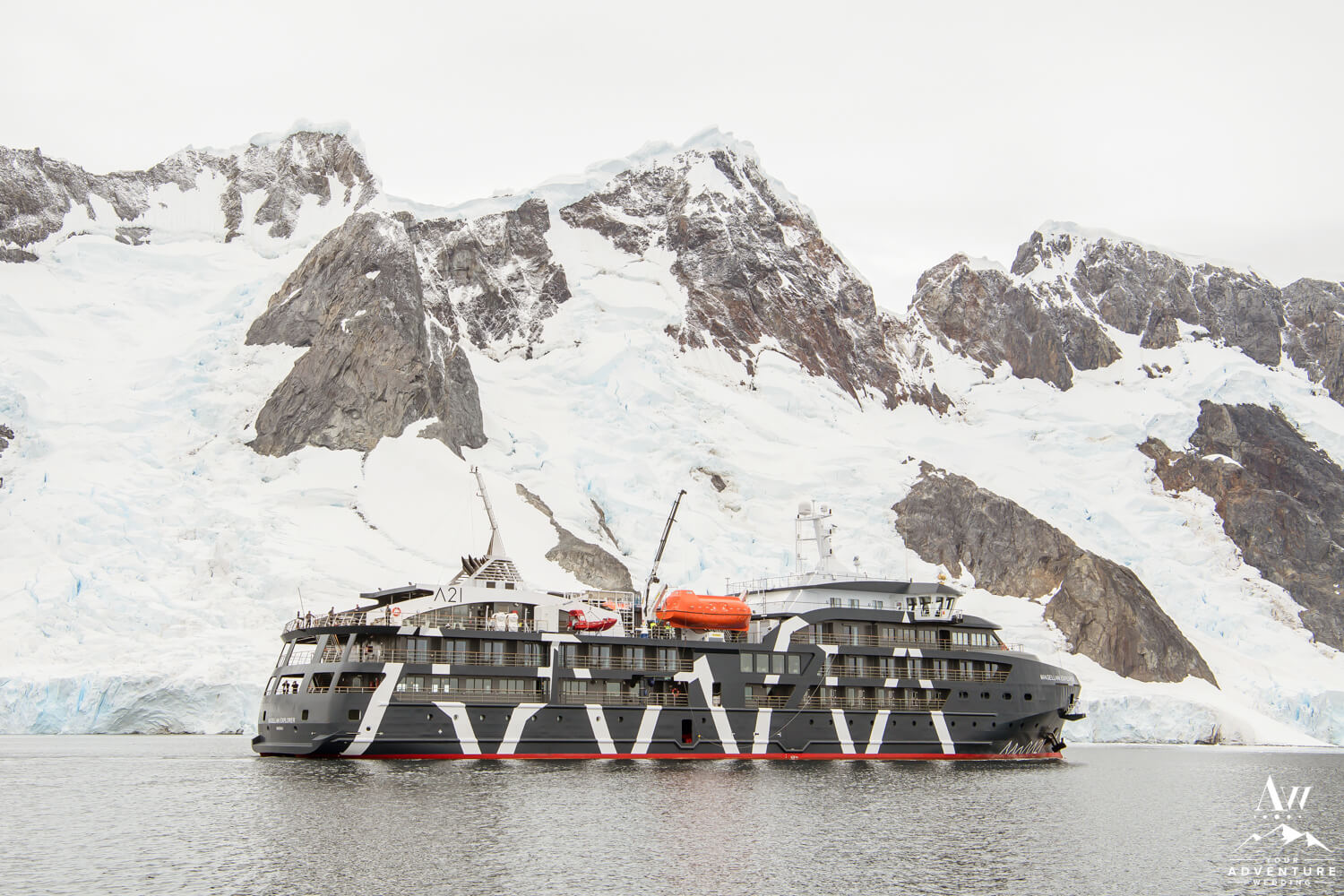 On the morning of February 28th 2020, Tylee and Jeff woke up in their Grand Suite aboard the Magellan Explorer. Being aboard a small boutique luxury ship in Antarctica ( less than 70 people for fly and sail experiences) you’re guaranteed a more intimate adventure and since the vessel is smaller it can be more nibble. Therefore sunrise brought the experience of sailing through the famed narrow Lamaire Channel. The scene outside of their balconies as they were getting ready, were steep cliffs and floating icebergs! Total MAGIC!