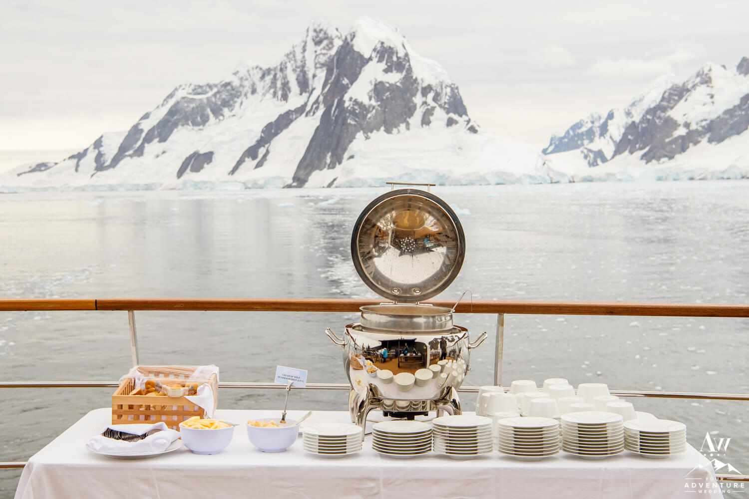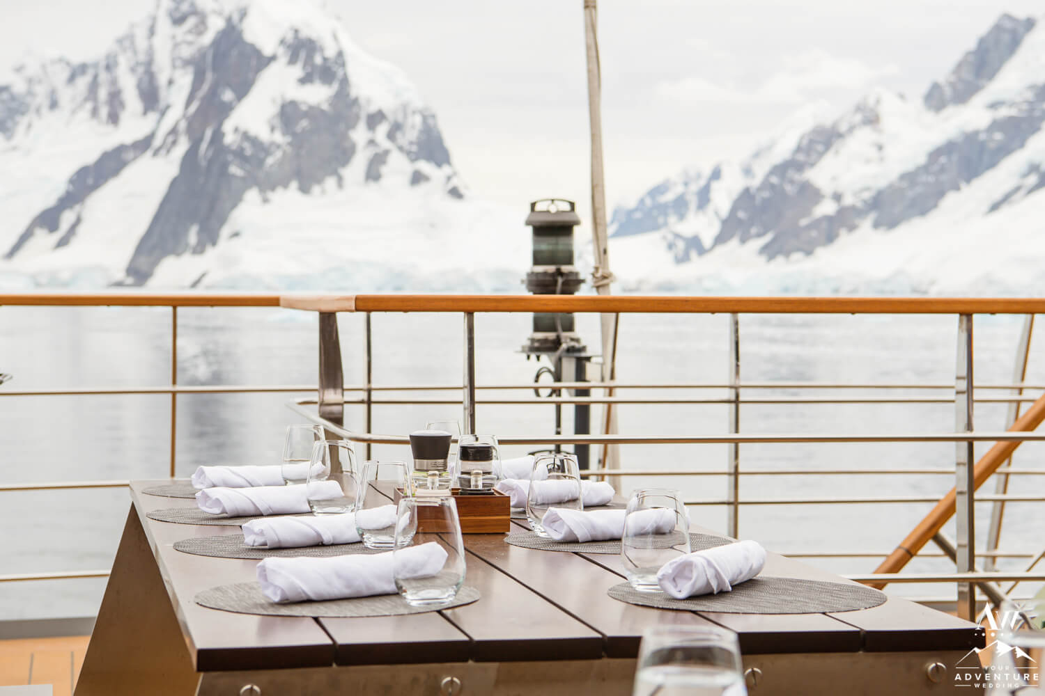 Our Antarctica wedding photographer got to work around 7:30am photographing the bride and grooms lovely details! Which is a bit later than our usual adventurous weddings, but our zodiac call time was 10am. Also since it is a luxury vessel, it offers beautiful spots to photograph Antarctica wedding photos as you’ll see below.
