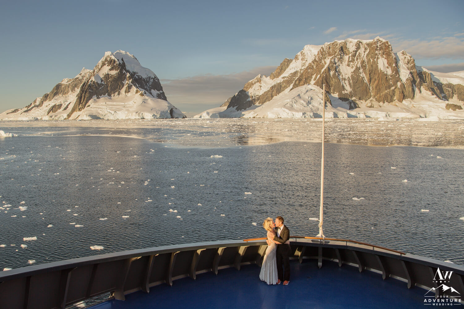 Next, rather than being married on Magellan Explorer by the “captain” symbolically, these two chose to have a legal wedding ceremony in the BAT (British Antarctic Territory). As a matter of fact, our team provided the legal celebrant as you’ll see soon! But before heading off onto their private zodiacs with their wedding guests, the photographer captured a few images on the bow of the boat before beginning their Antarctica wedding expedition!