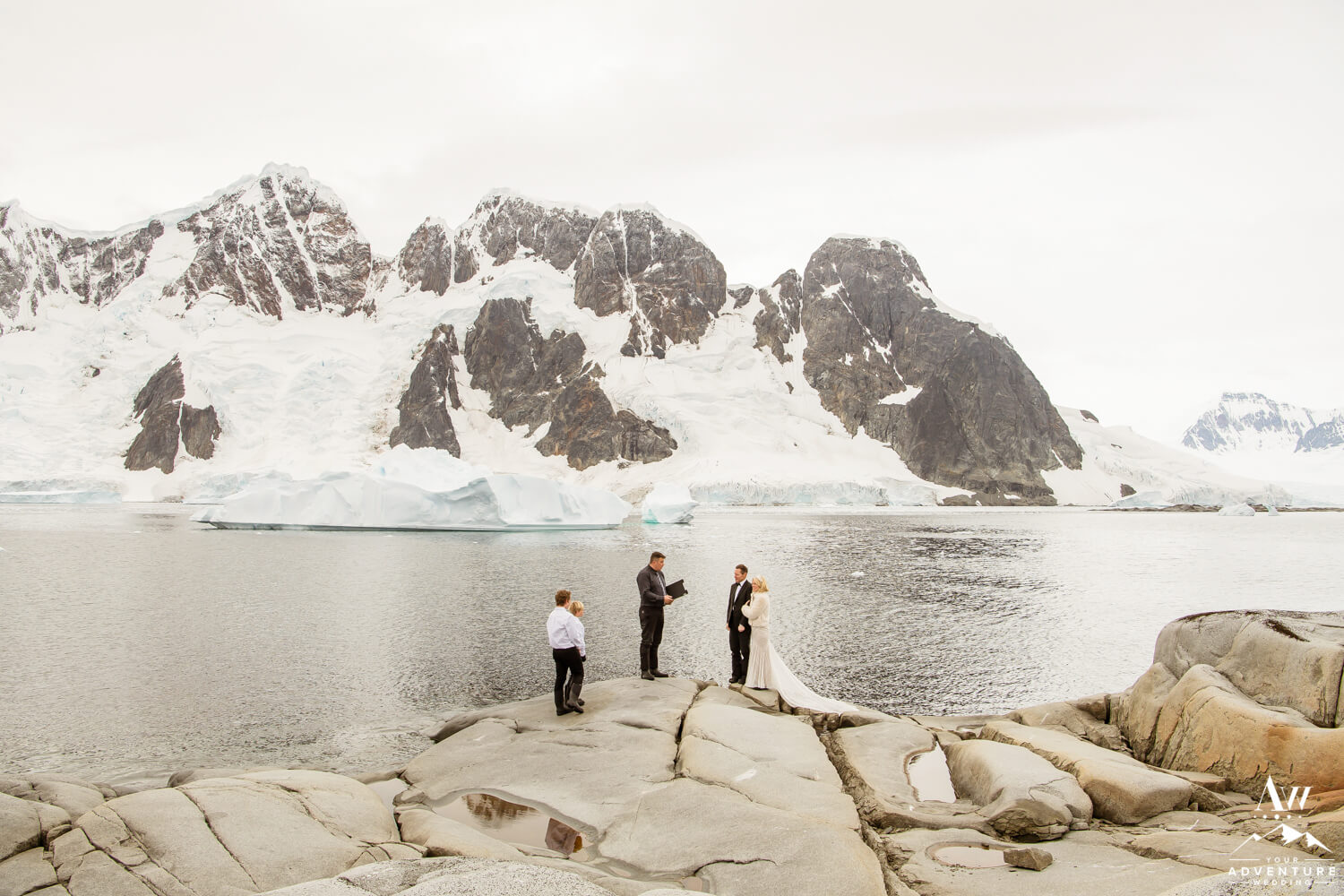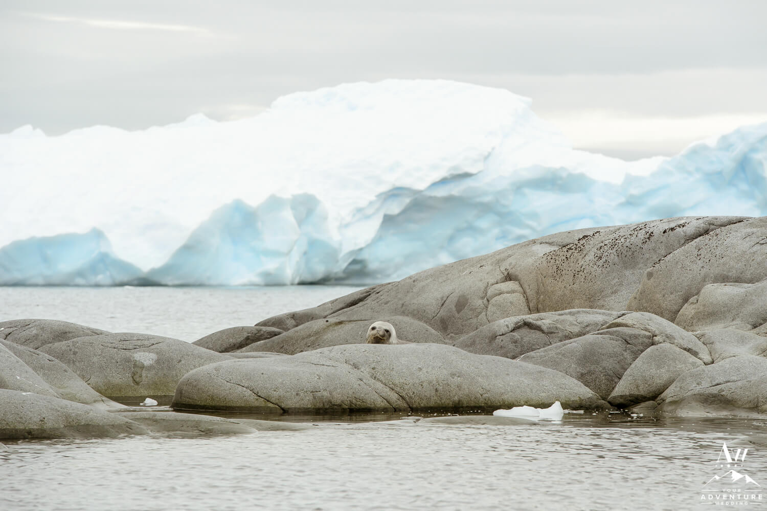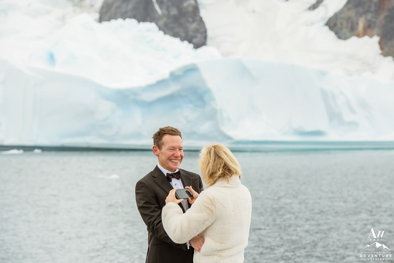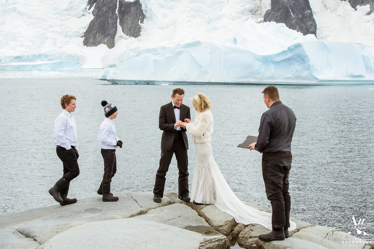 Meanwhile, to further ensure privacy, our Antarctica wedding expedition group went to a completely different area than the rest of the population of folks on the ship. In fact, Tylee and Jeff were married on their very own private island with Port Charcot. Where they had 360 degree views of glacier falls, icebergs, rock formations. Additionally to their 2 wedding guests, they had seals, whales, and penguins watching too!