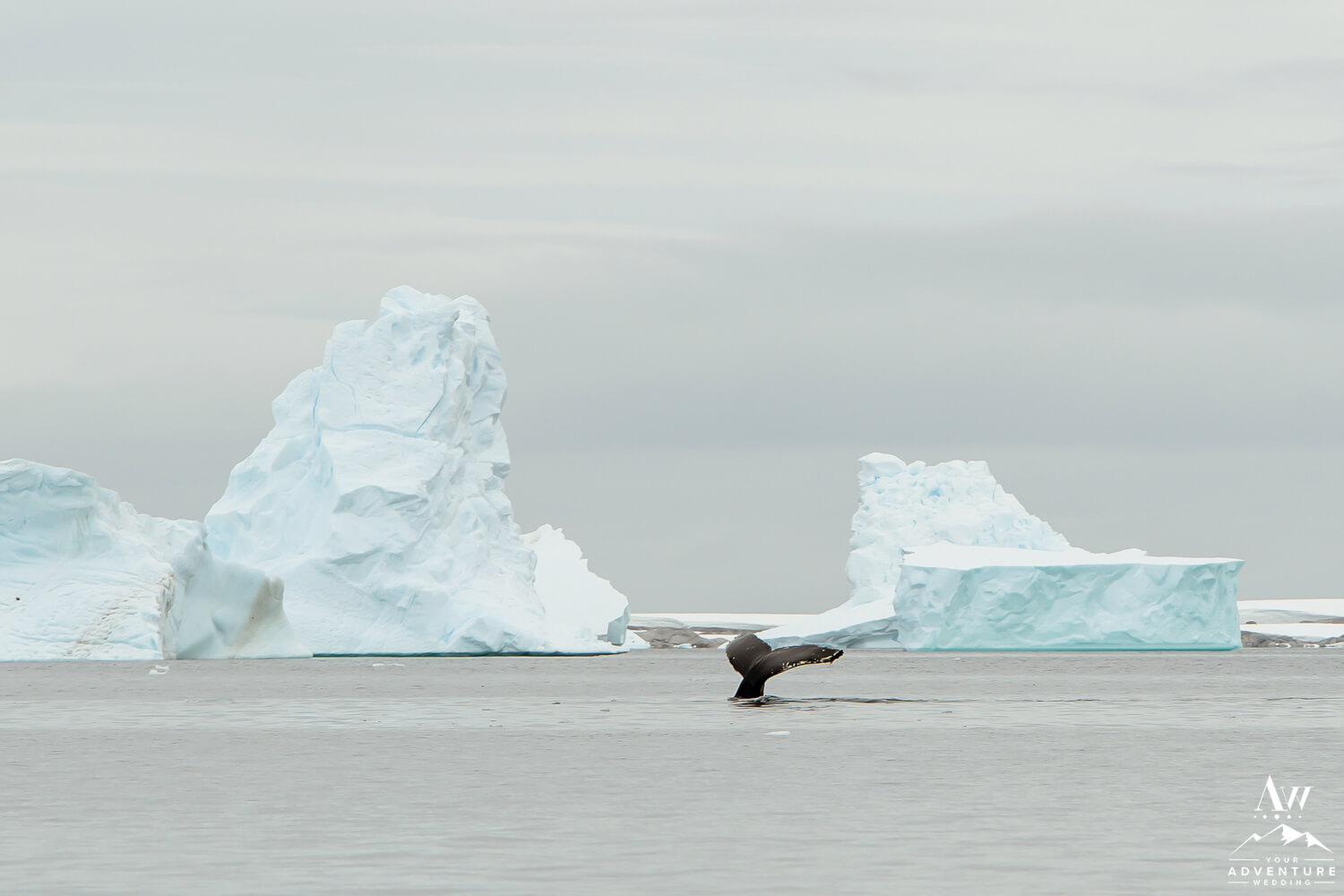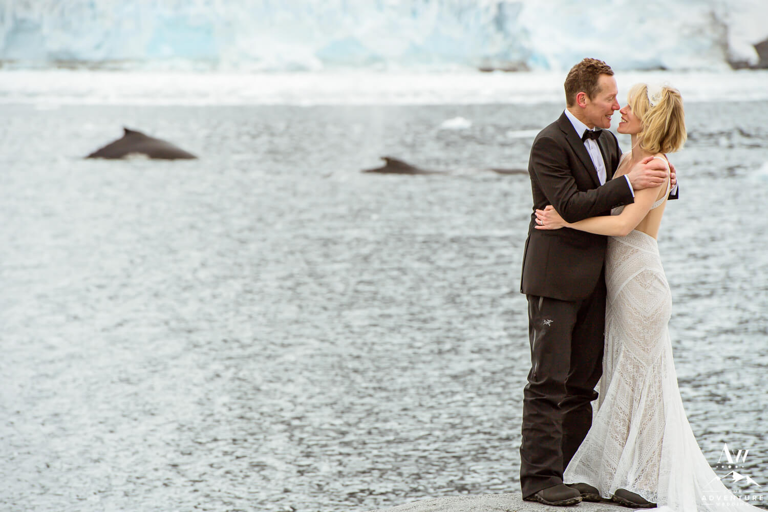 Furthermore, our team member, Davíð Geir Jónasson, had been previously certified by the British Antarctic Territory (BAT) to be able to perform a legally binding ceremony. Above all, the ceremony was incredibly special and as Davíð invited the couple to exchange rings, a squawking from the nearby penguins came almost as if in celebration! Once the ceremony was over, our Antarctica elopement photographer began taking portraits and whales even came to bless their marriage! You’ll see them jumping in the once in a lifetime wedding photos below…