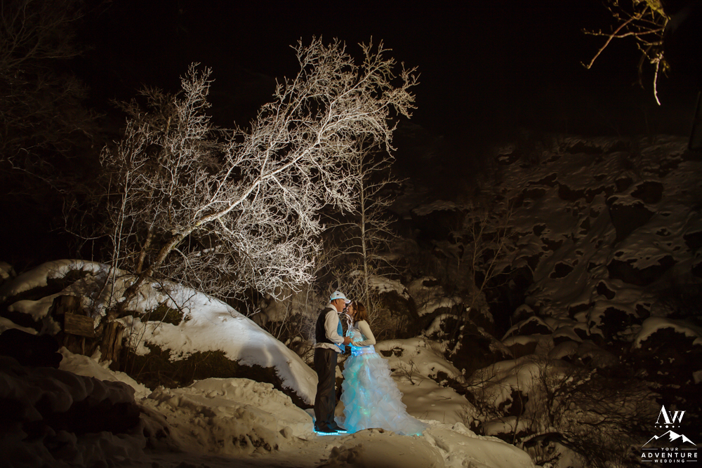 Traveling to an area that will have tons of snow? Then get out in it! Having night wedding photos in a snowy winter wonderland is an ideal way to end your wedding adventure! And what if you stepped up your game and had a light up elopement dress like this bride?