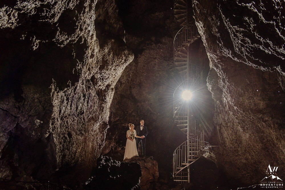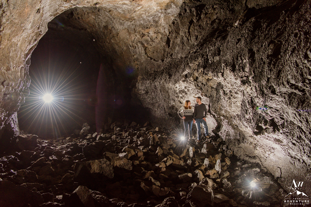 Next, most times in lava tubes, night wedding photos can be done during the day too! One of the coolest things about having adventure night wedding photos in a lava tube is that the icicles build from the ground up! For instance, you’ll see in front of the couple below, upside down icicles from water dripping and building. Super cool effect for night time wedding photos! Note: Our adventure elopement photographers are skilled in off camera flash as well to be able to craft unique lighting situations.