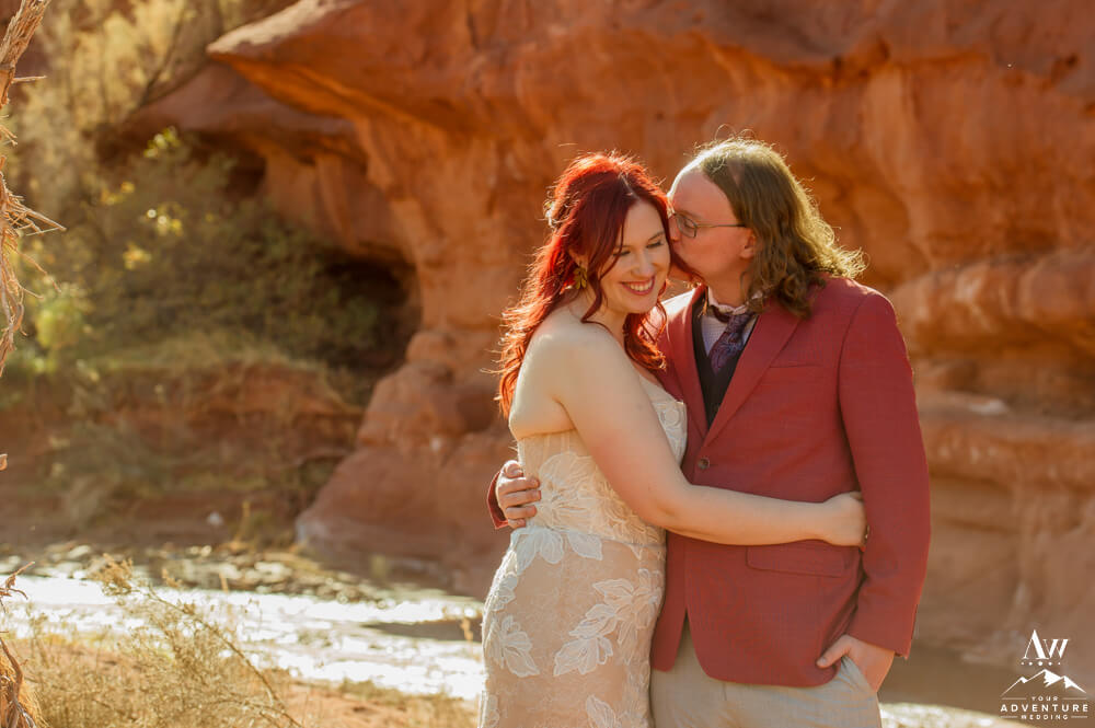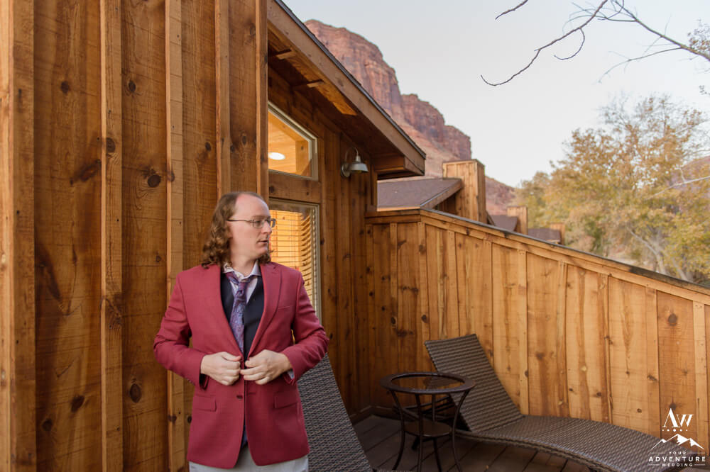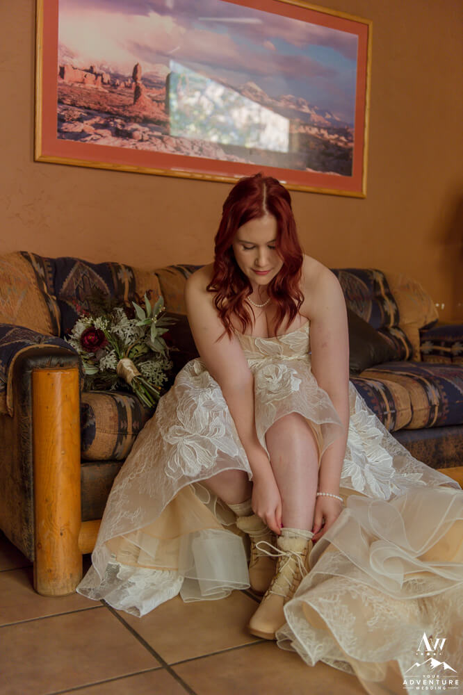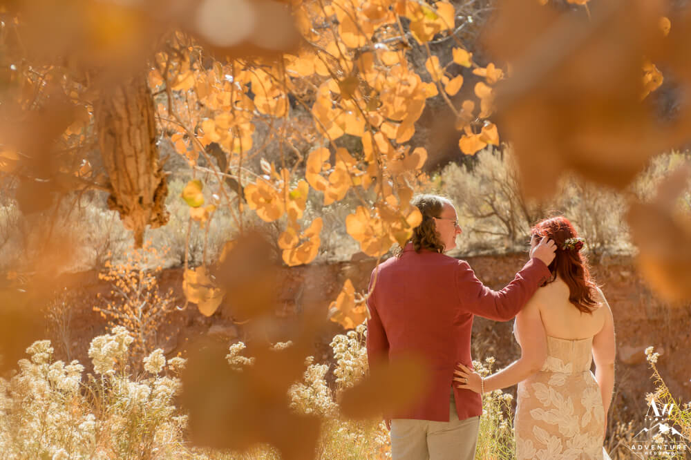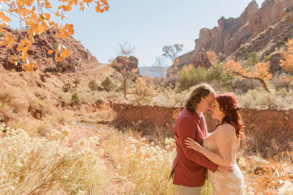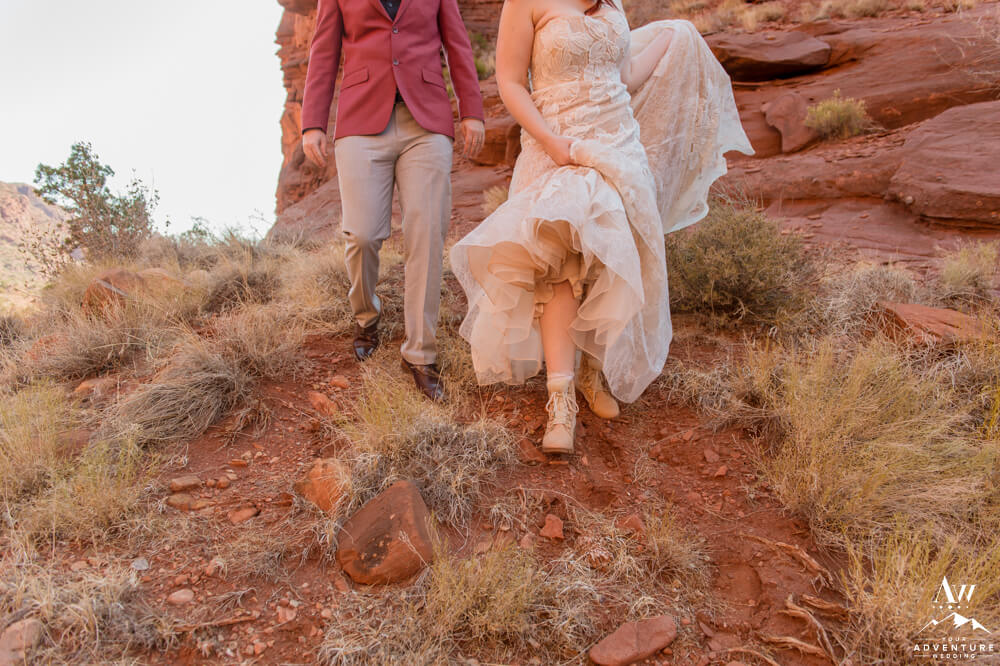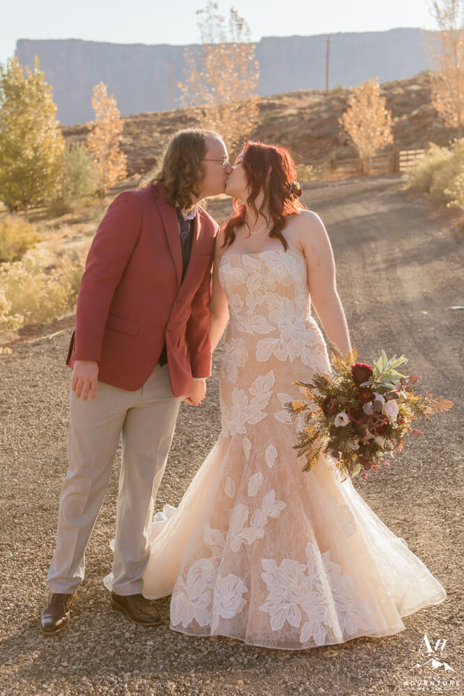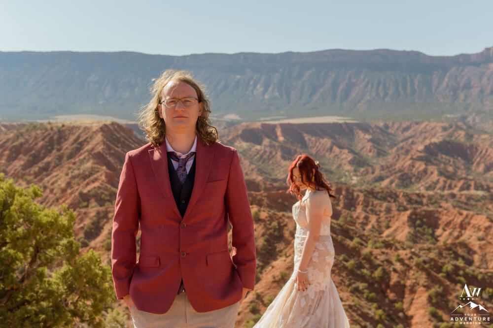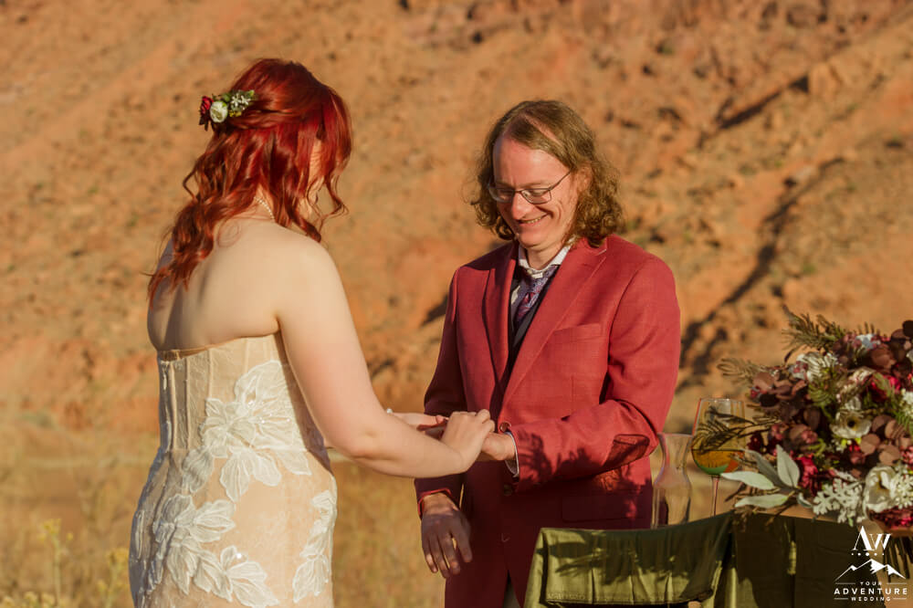 Molly and Kurtis began their November elopement in Moab well before sunrise at the Red Cliffs Lodge. In fact, our fantastic Utah elopement photographer, Jean was rocking it out capturing all of their amazing details while they got ready together. How beautiful is Molly’s adventure wedding dress and the red suit Kurtis donned?!