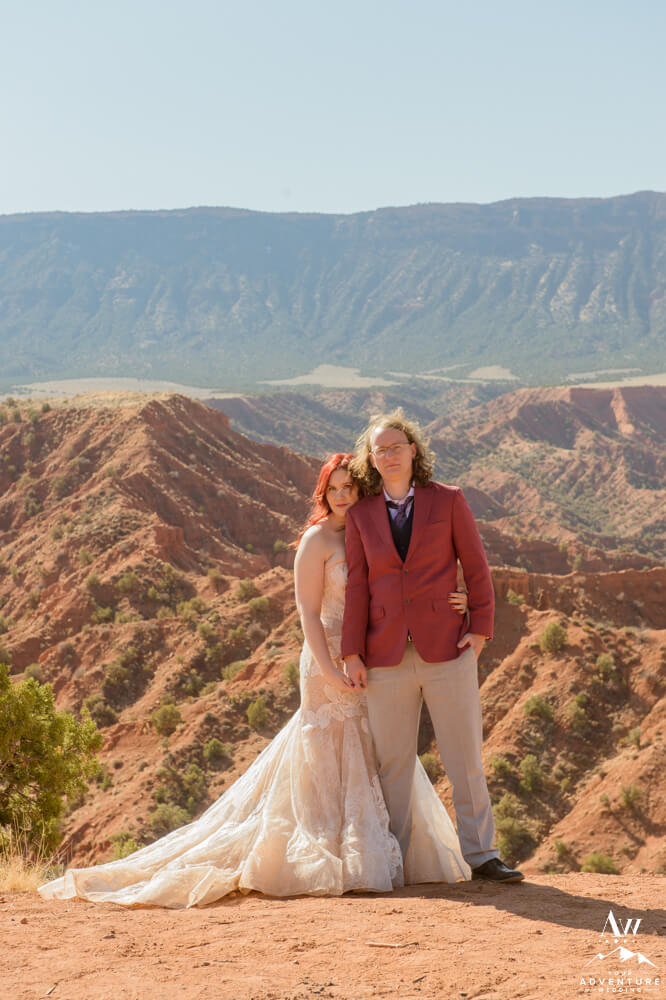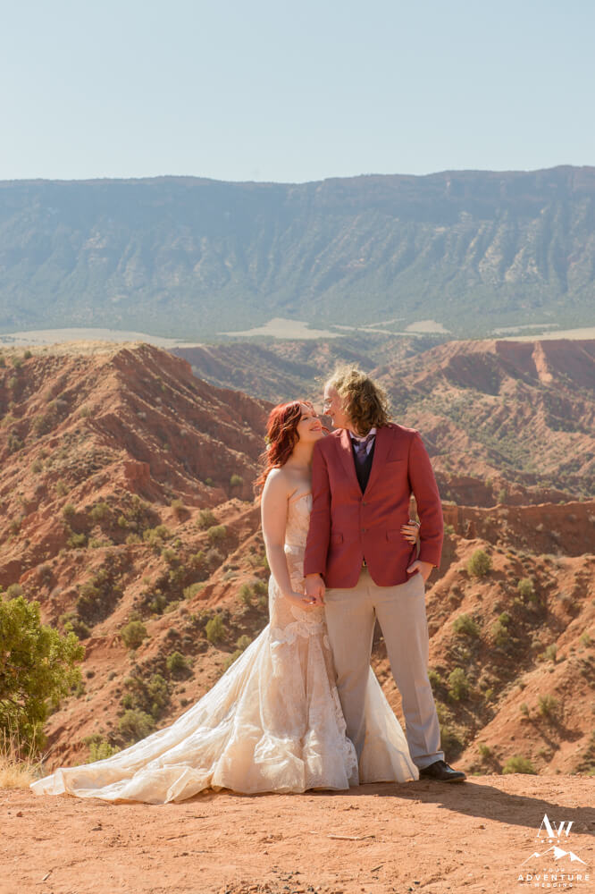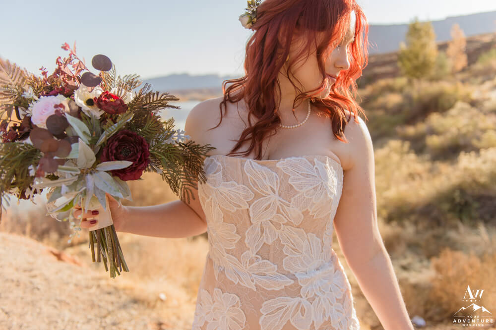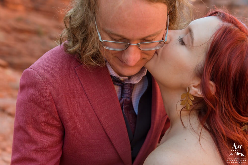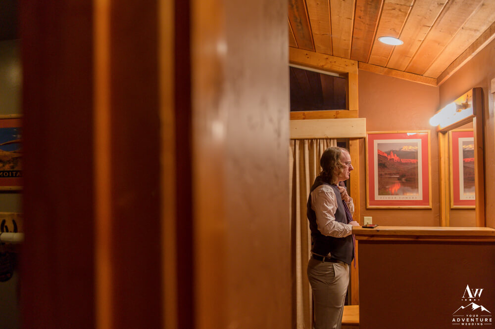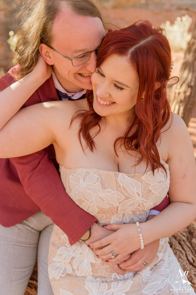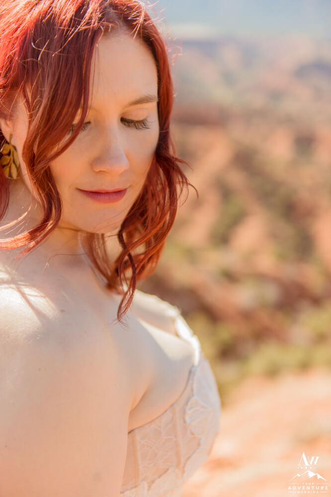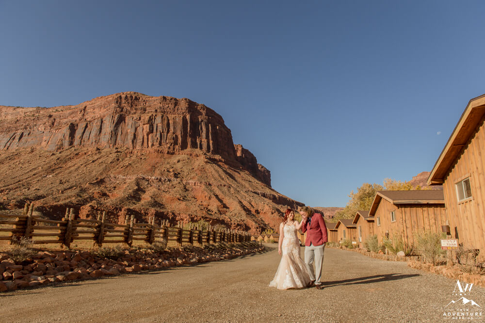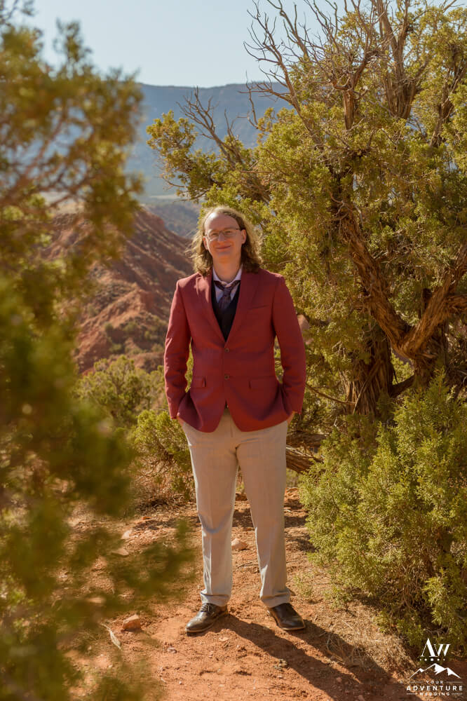 Molly and Kurtis began their November elopement in Moab well before sunrise at the Red Cliffs Lodge. In fact, our fantastic Utah elopement photographer, Jean was rocking it out capturing all of their amazing details while they got ready together. How beautiful is Molly’s adventure wedding dress and the red suit Kurtis donned?!