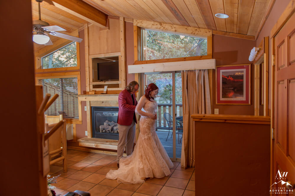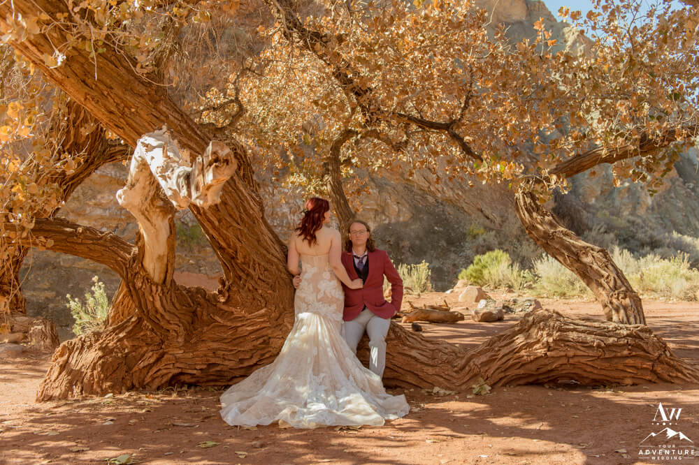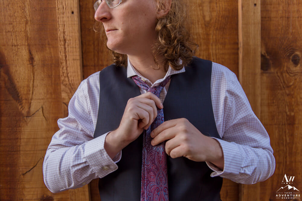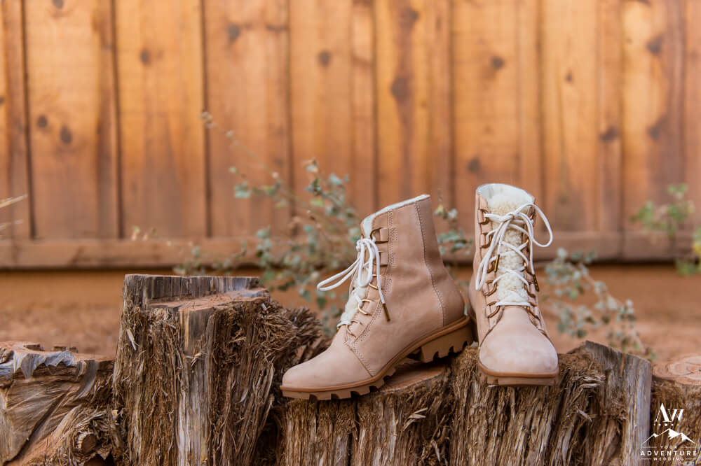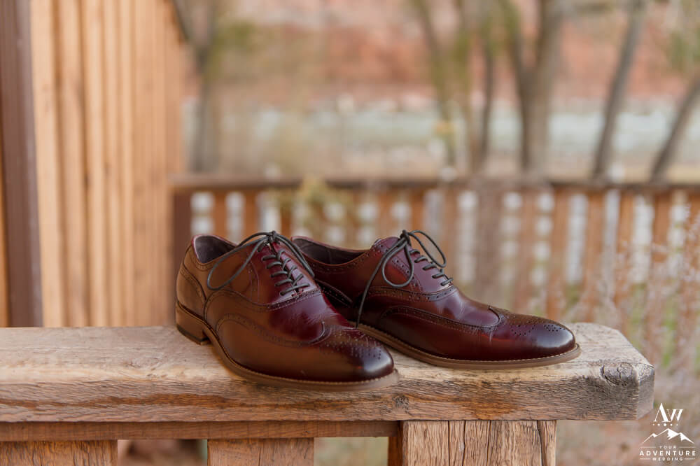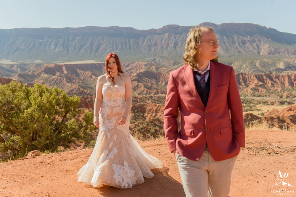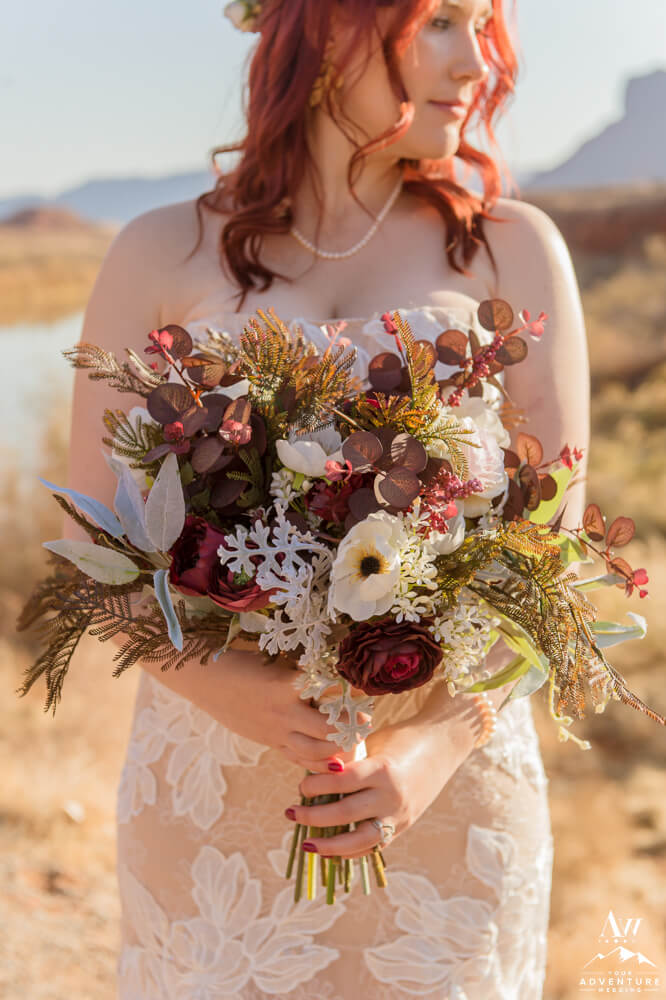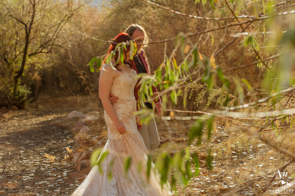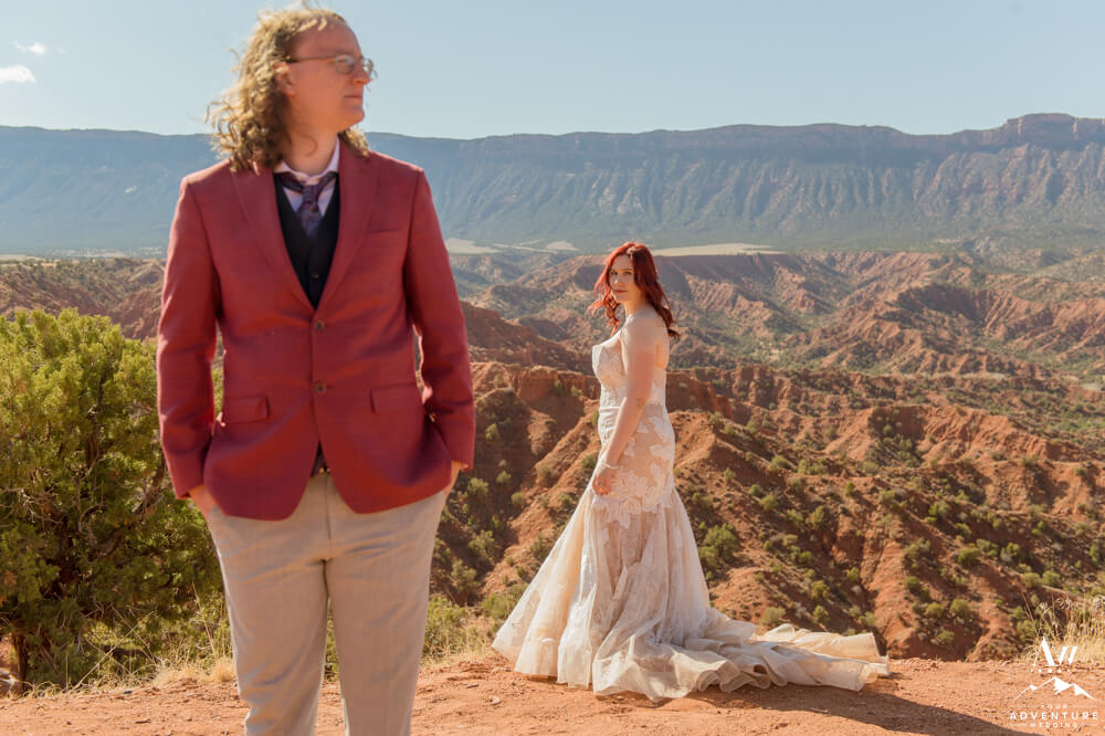 Molly and Kurtis began their November elopement in Moab well before sunrise at the Red Cliffs Lodge. In fact, our fantastic Utah elopement photographer, Jean was rocking it out capturing all of their amazing details while they got ready together. How beautiful is Molly’s adventure wedding dress and the red suit Kurtis donned?!