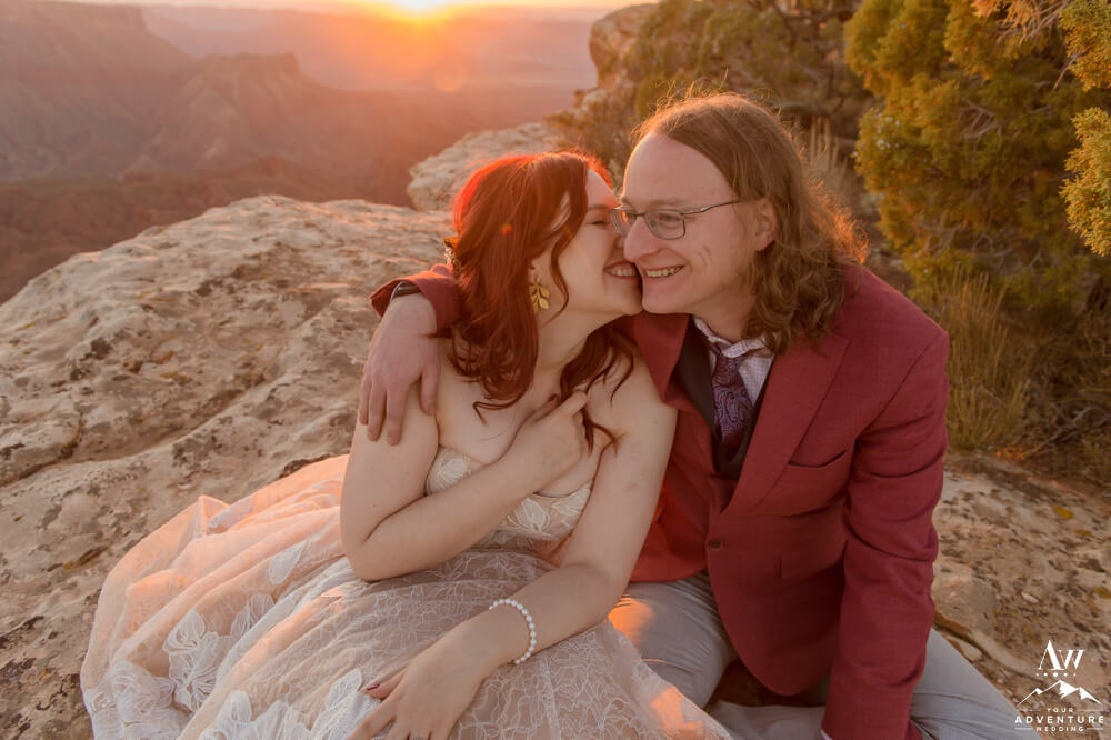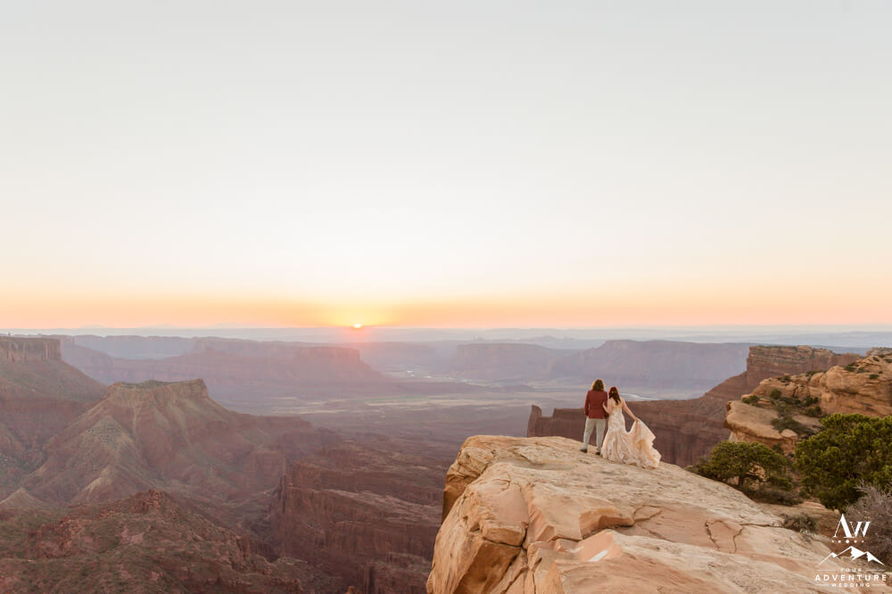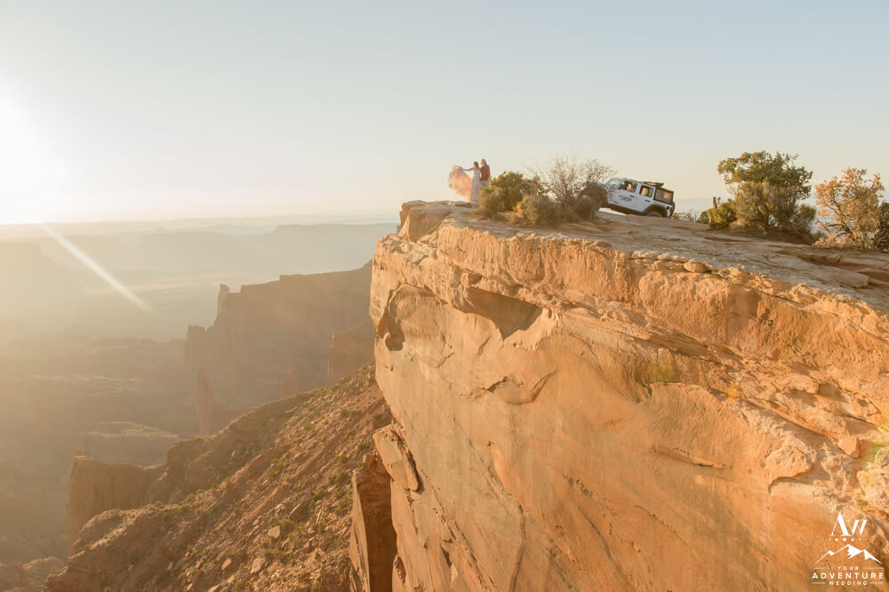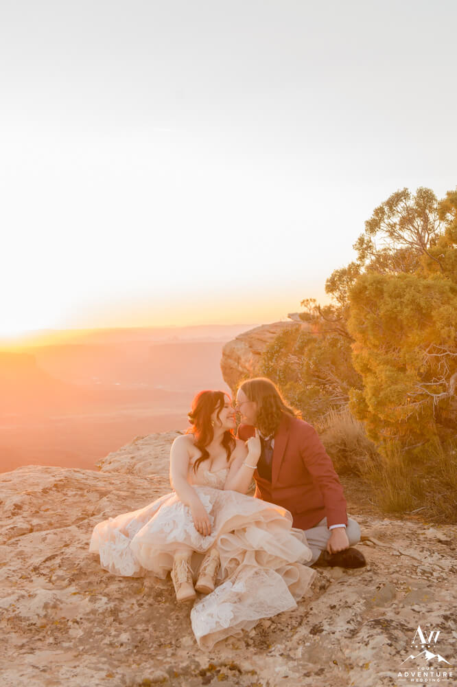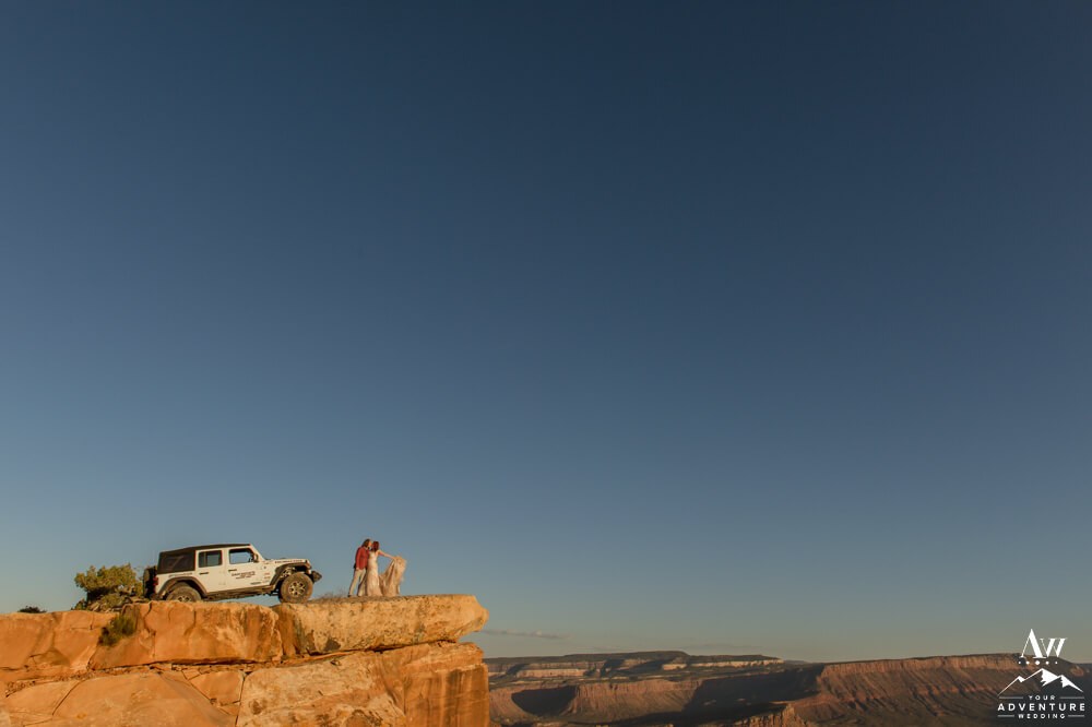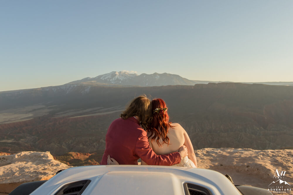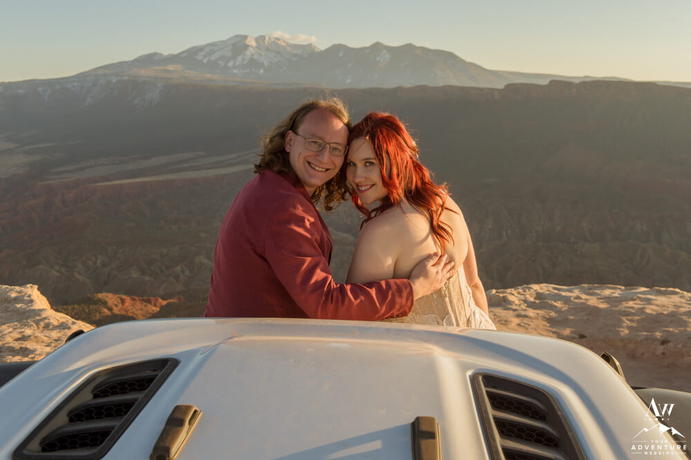 Witnessing a sunset from on top of a mountain makes you feel alive. Also it’s a pretty freaking epic way to end your Moab Utah elopement too! For instance, the last location on their elopement adventure schedule was rock crawling up to the “Top of the World.” These two spent at least 45 minutes basking in the glory of nature, the world, and Utah taking it all in!!