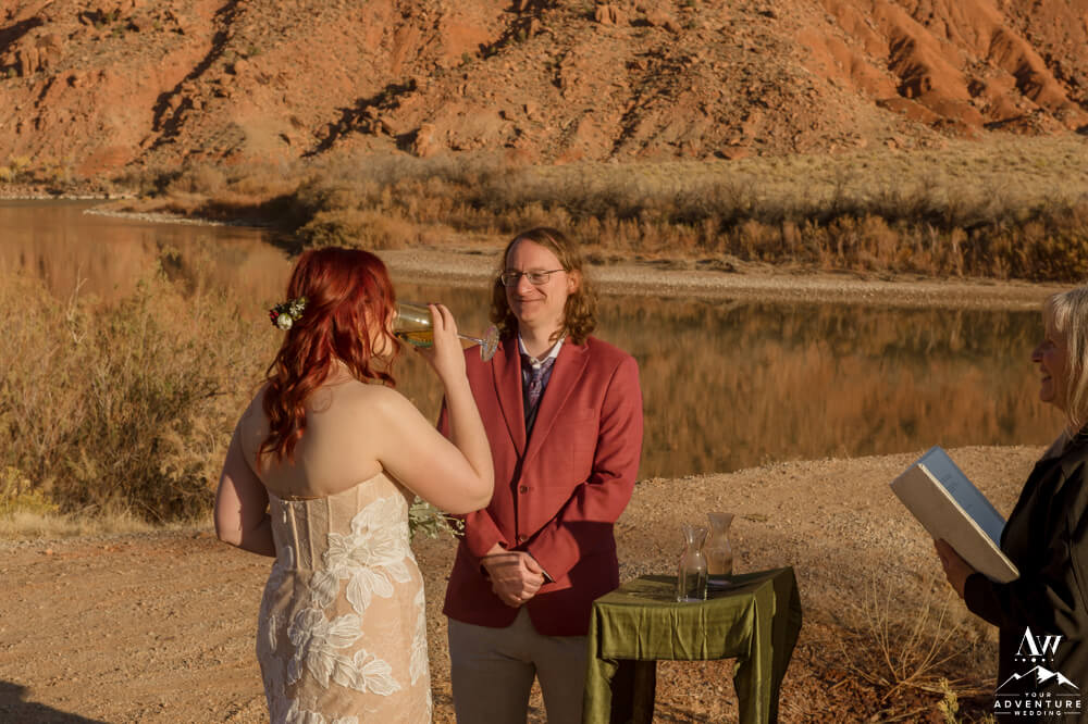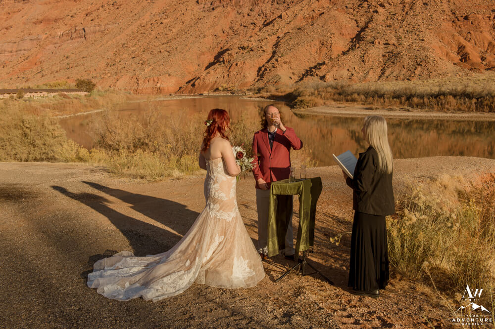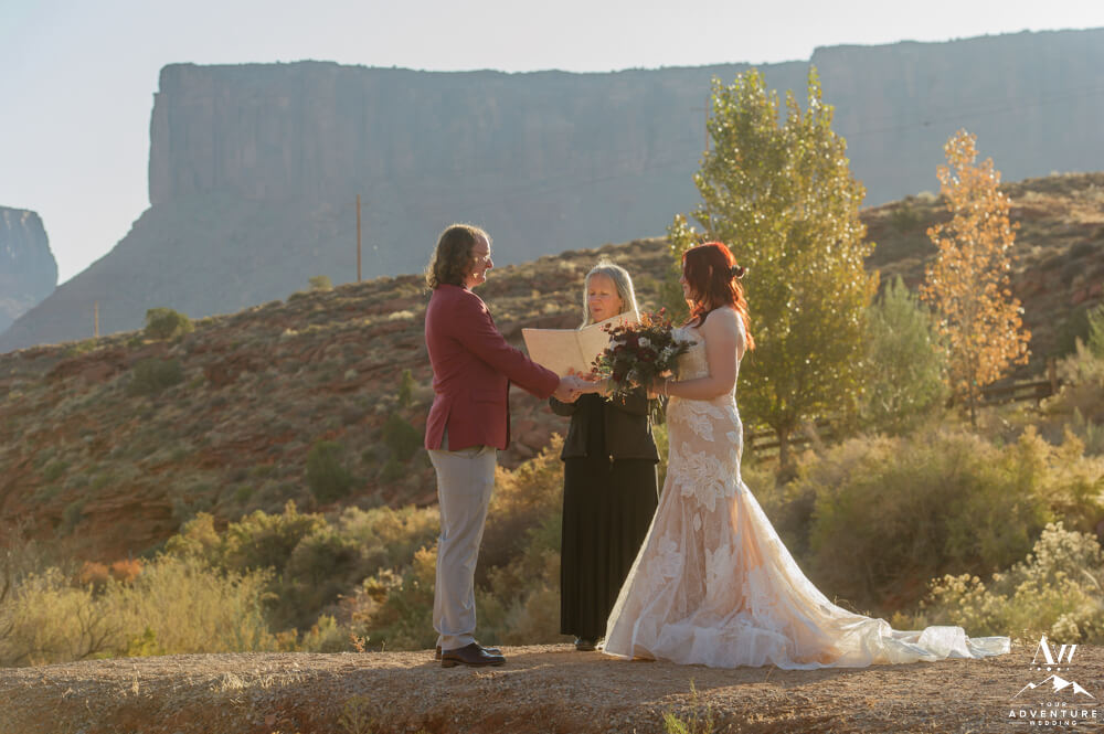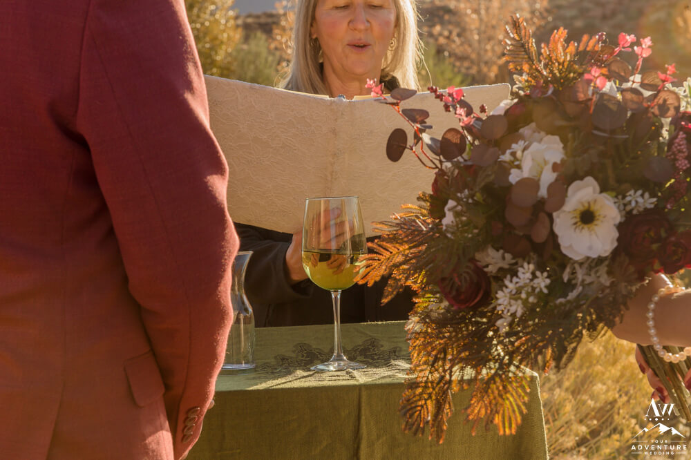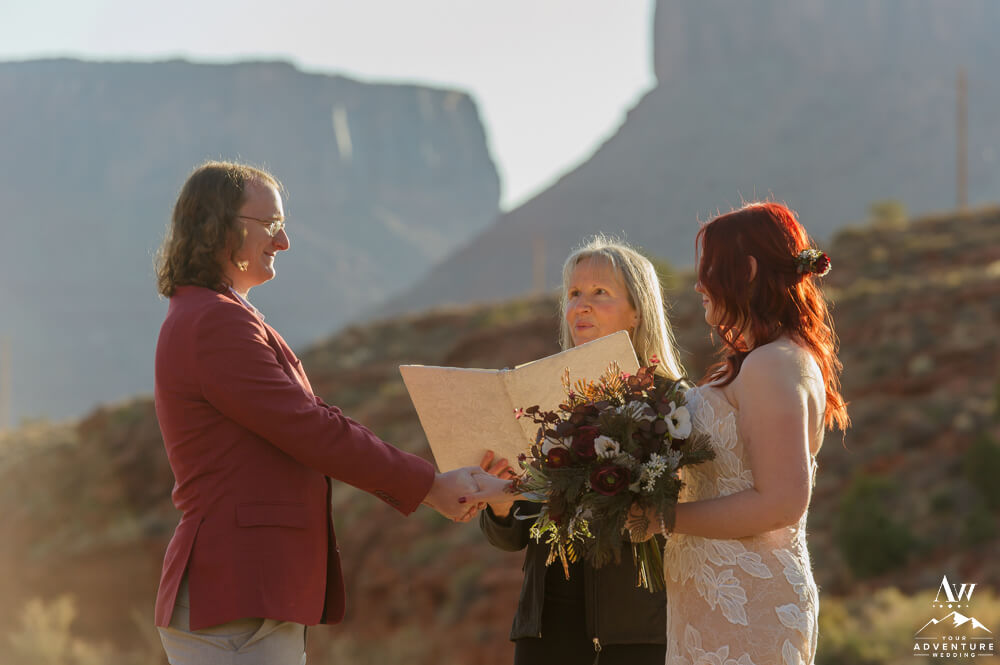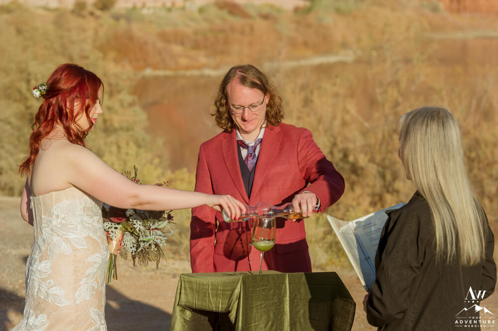 On with the adventure and vows! Shortly after sunrise, the soon to be newlyweds and their amazing celebrant, Linda Radford found their way to the stunning Moab wedding ceremony location! The sun warmly lit the mountains surrounding as they professed their lifetime love to each other. Further, they even further personalized the Moab Utah elopement ceremony by having a wine ceremony. Following their gorgeous morning ceremony they ventured around exploring the beautiful area as husband and wife!