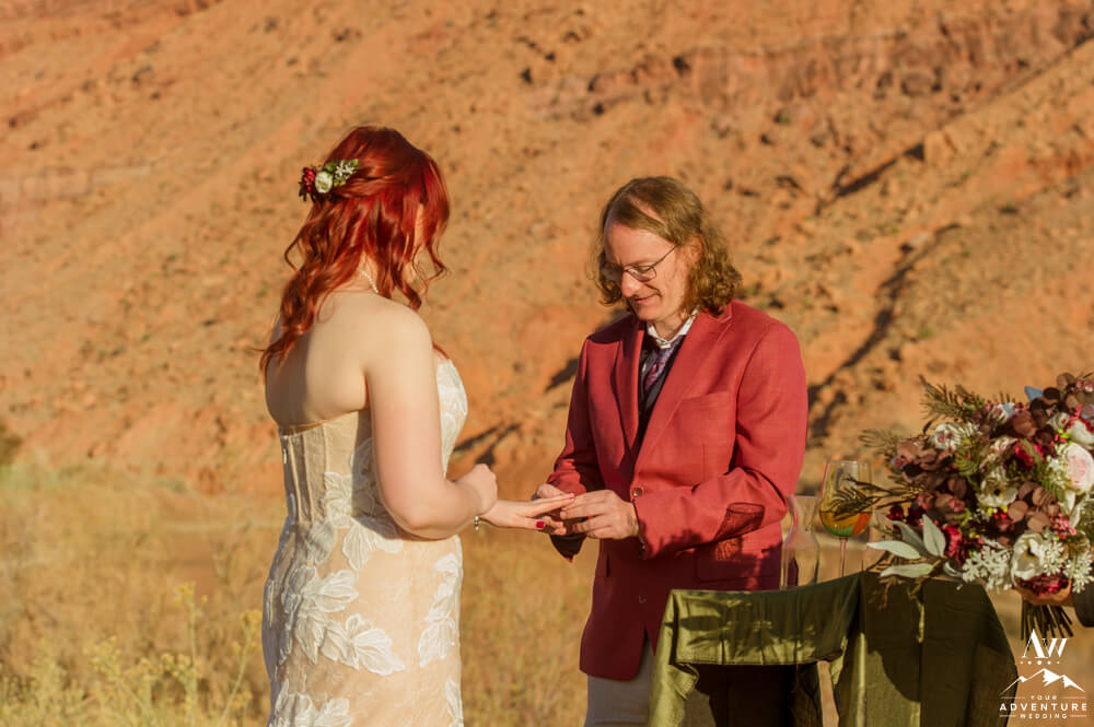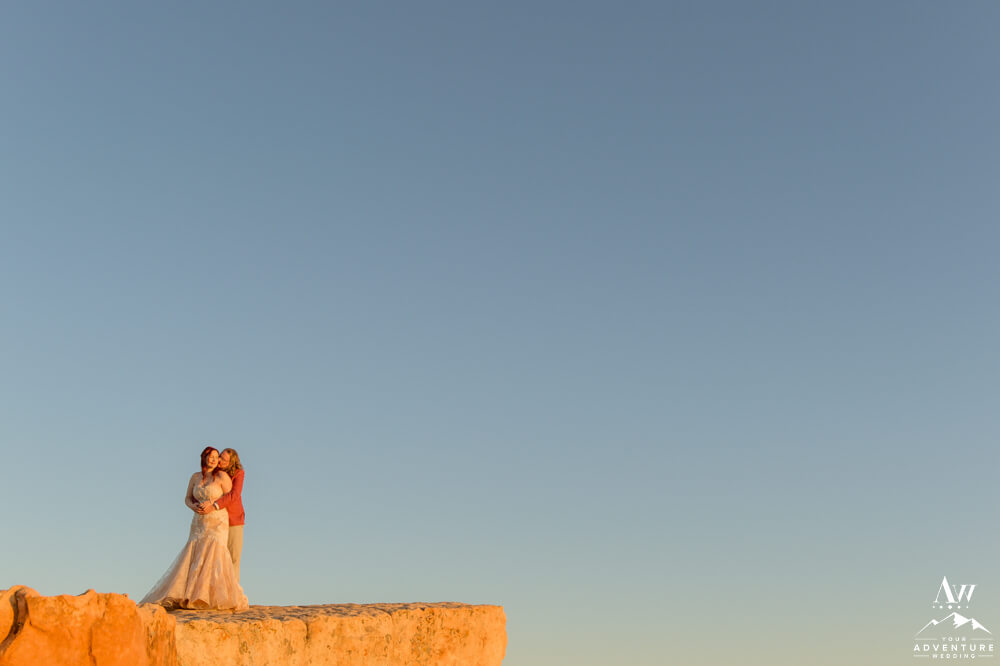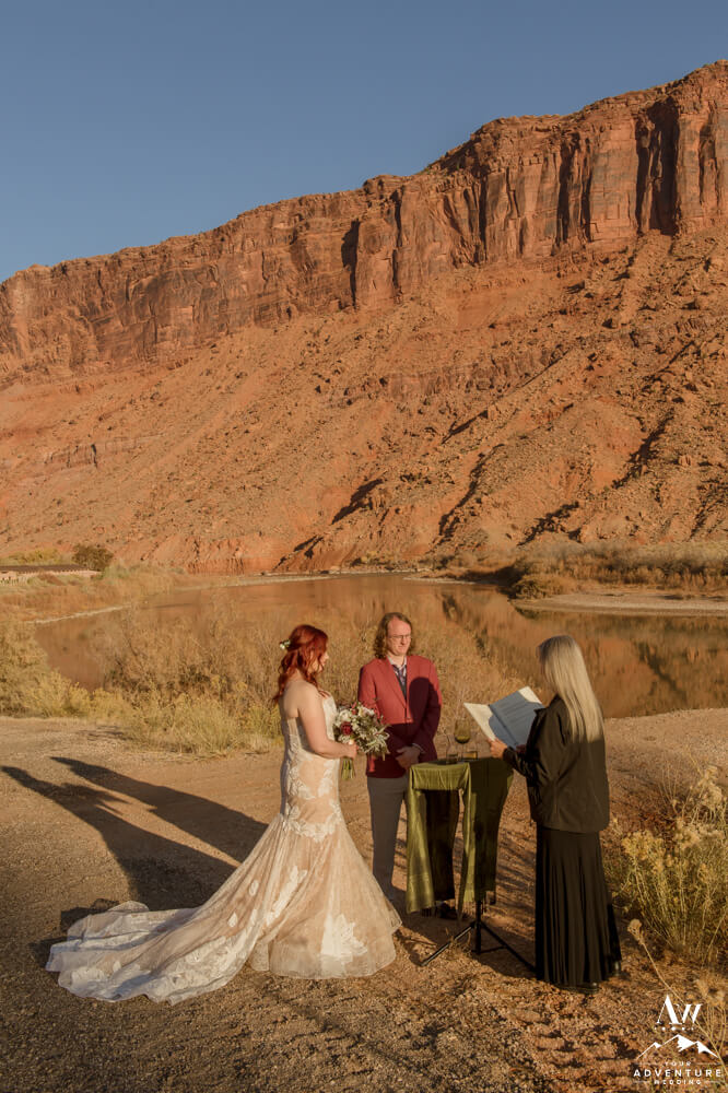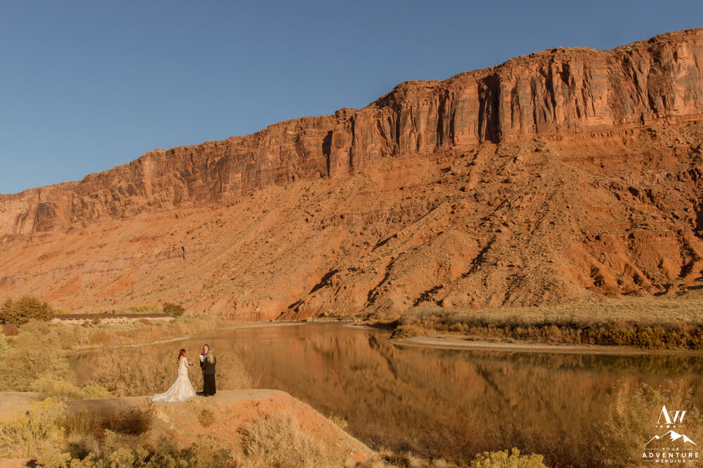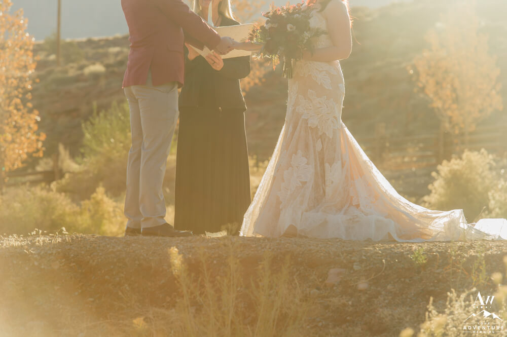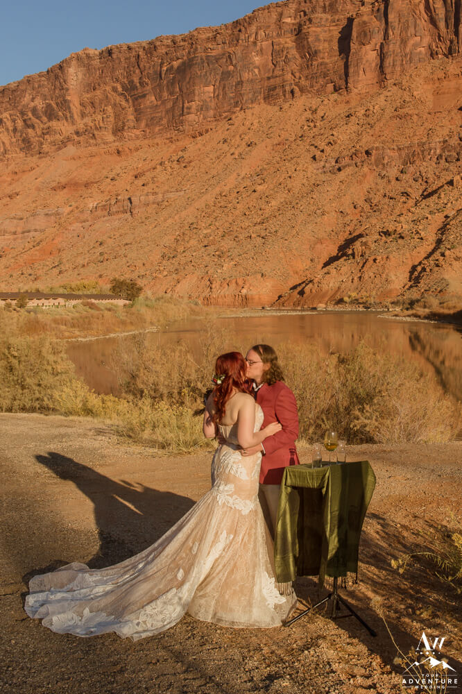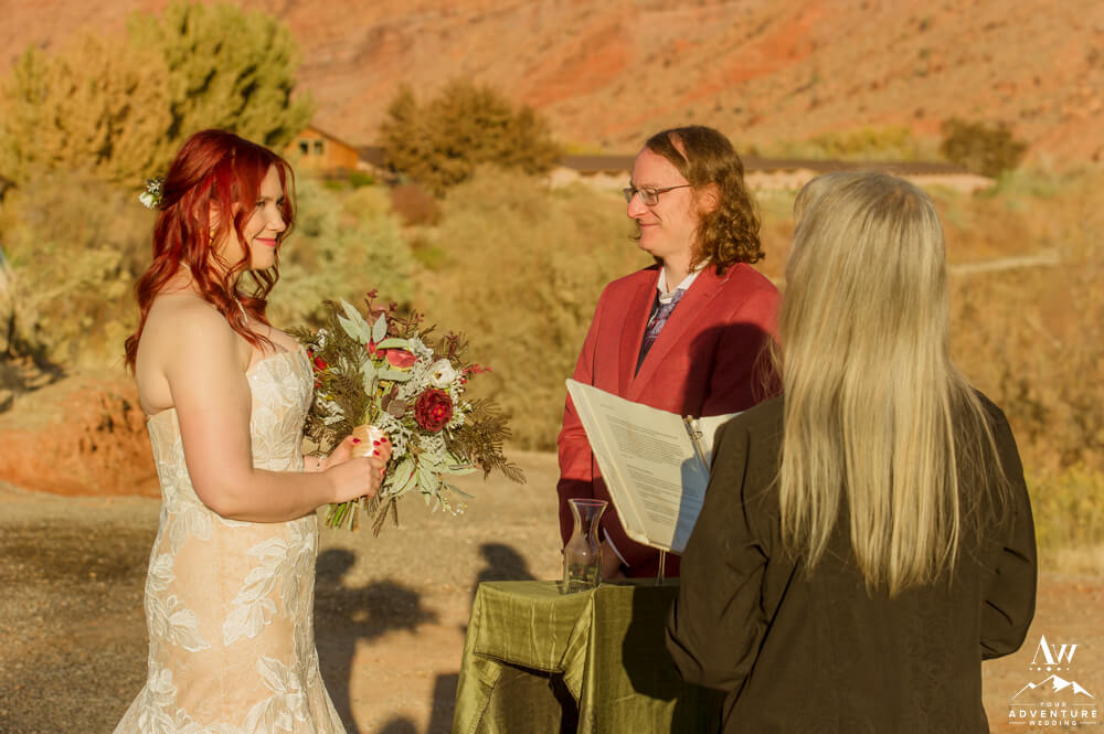 On with the adventure and vows! Shortly after sunrise, the soon to be newlyweds and their amazing celebrant, Linda Radford found their way to the stunning Moab wedding ceremony location! The sun warmly lit the mountains surrounding as they professed their lifetime love to each other. Further, they even further personalized the Moab Utah elopement ceremony by having a wine ceremony. Following their gorgeous morning ceremony they ventured around exploring the beautiful area as husband and wife!