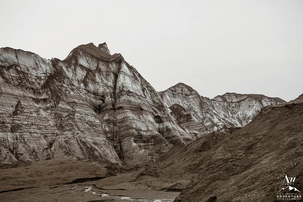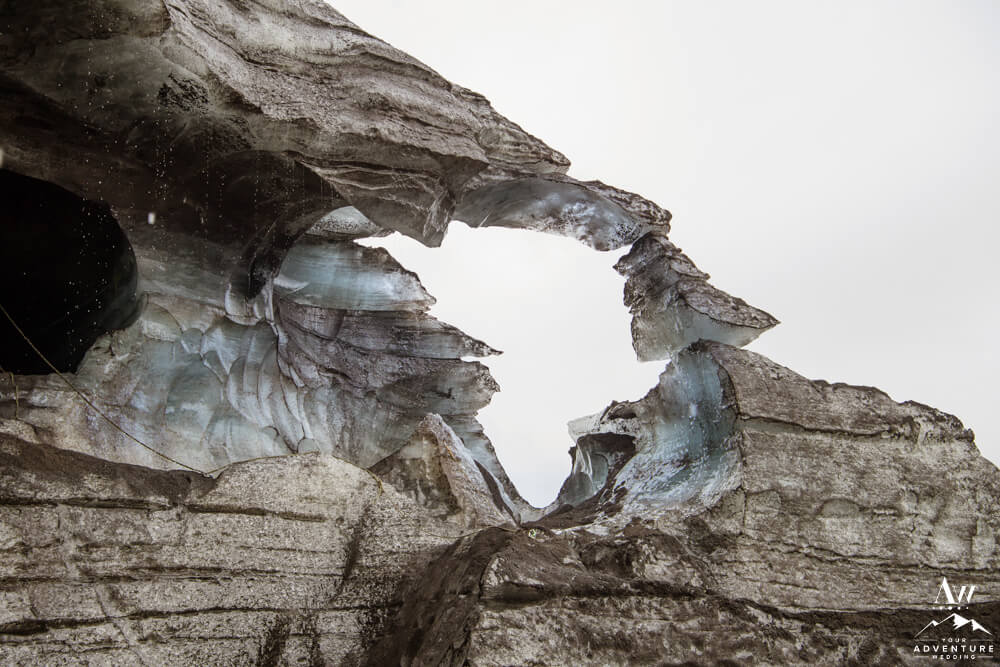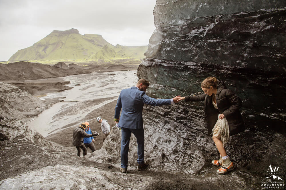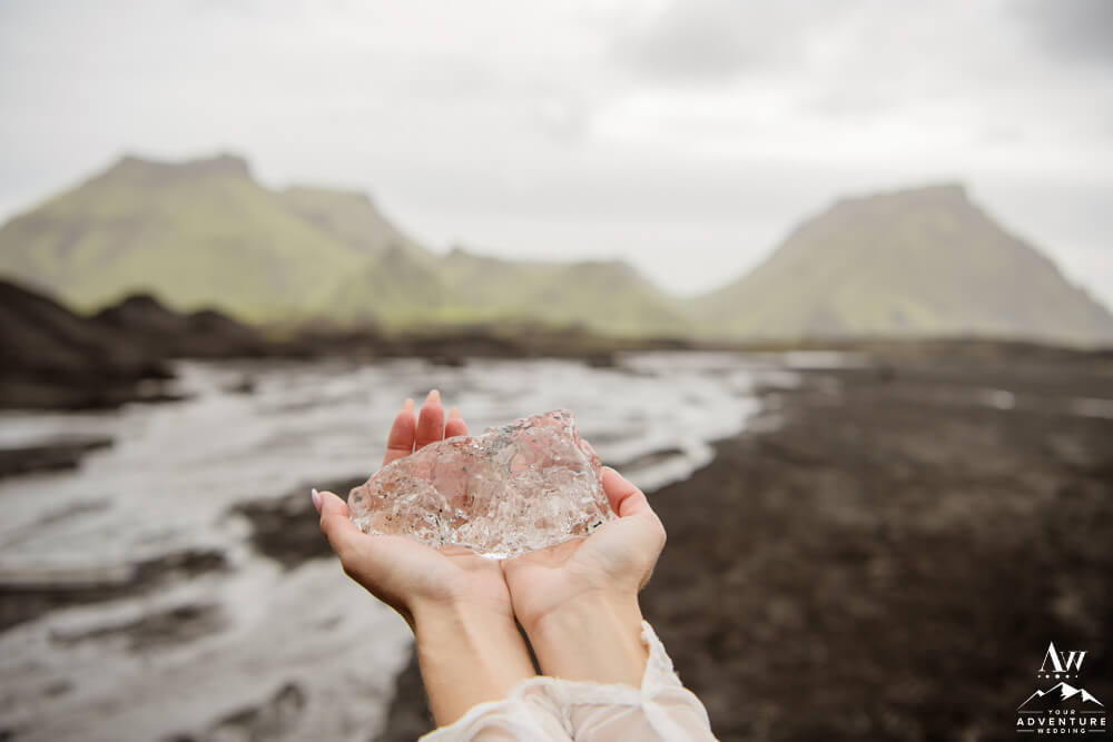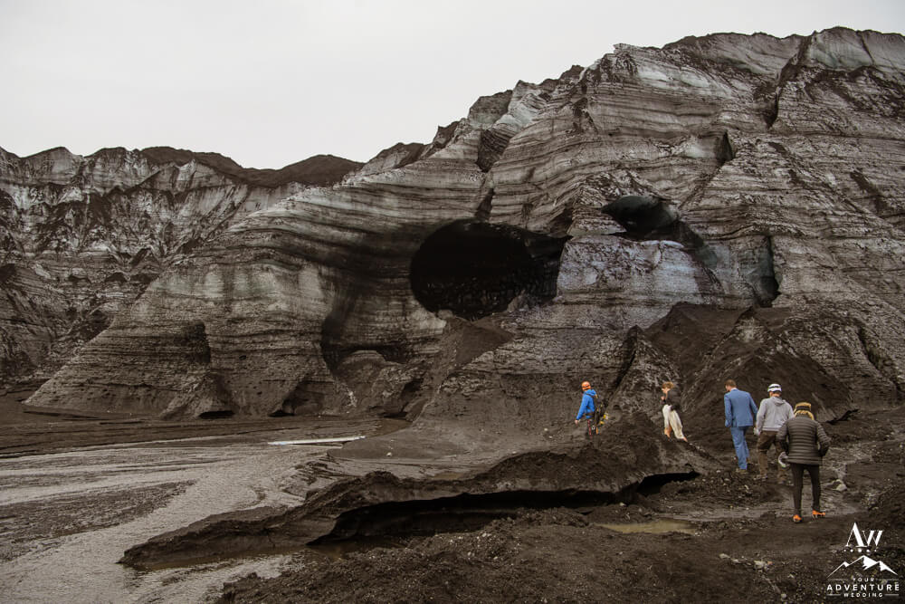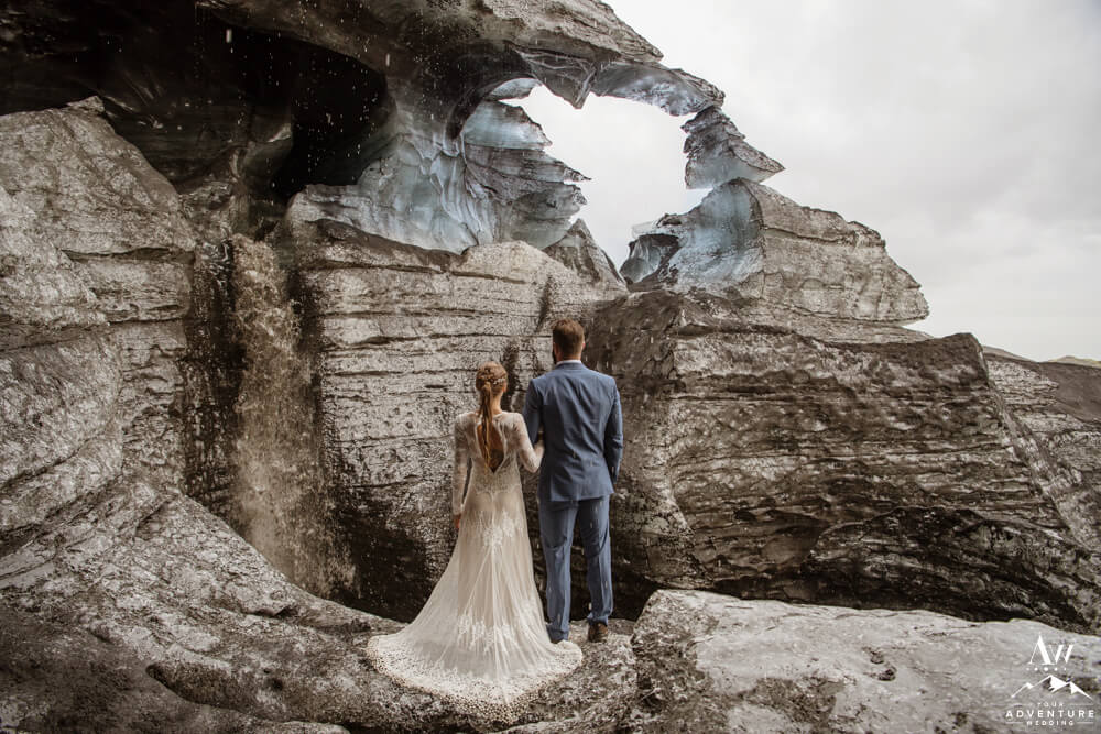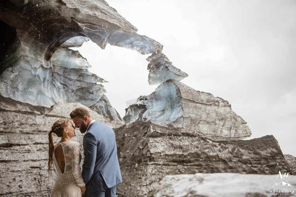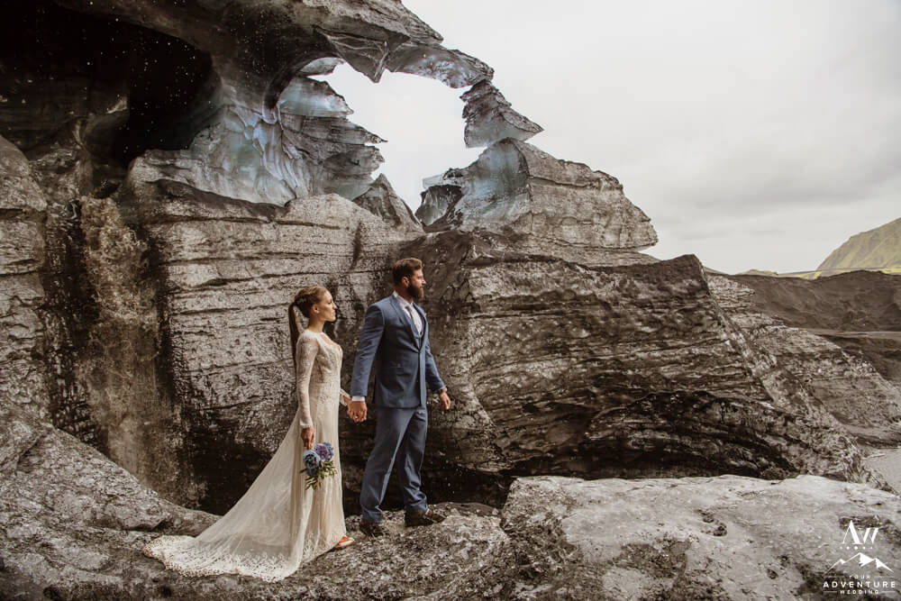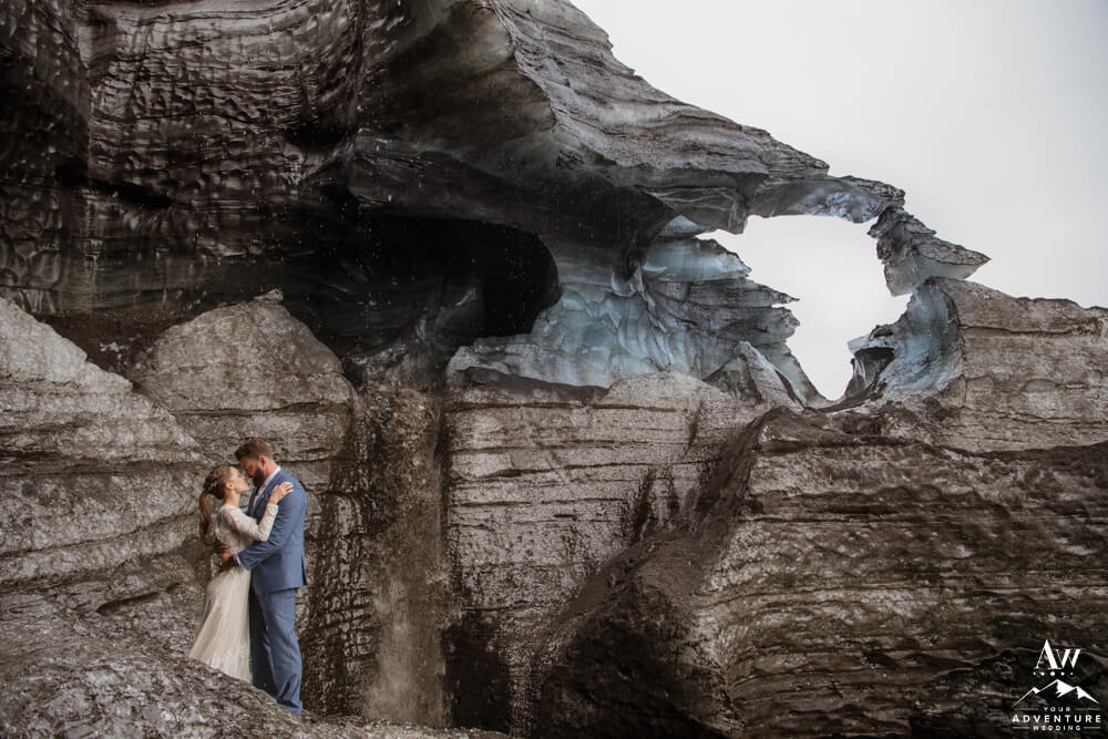 Glaciers are one of the most mysterious kind of landscapes to discover. Especially the glaciers in Iceland, which are often a mix of white, black, and blue ice. Plus the area is ever changing, so in trekking around this area you never know what kind of features you’ll be greeted with! To illustrate, the ice cave features you see below, broke a part the day after their waterfall elopement adventure.